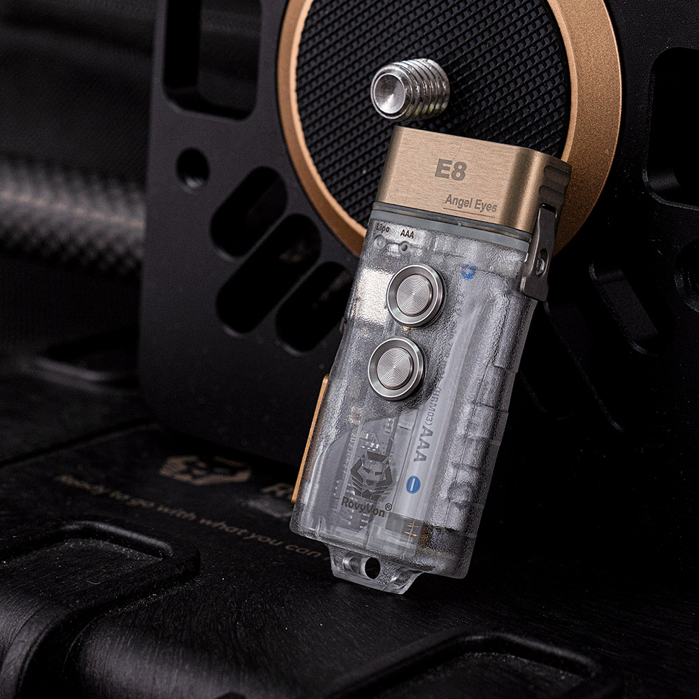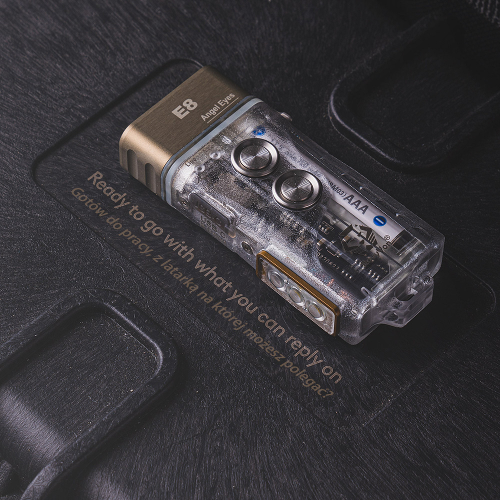 Angel Eyes E8 to latarka z linii kompaktowych, poręcznych latarek codziennego użytku (EDC – EveryDay Carry) z hybrydowym zasilaniem. Posiada dwie diody czołowe.