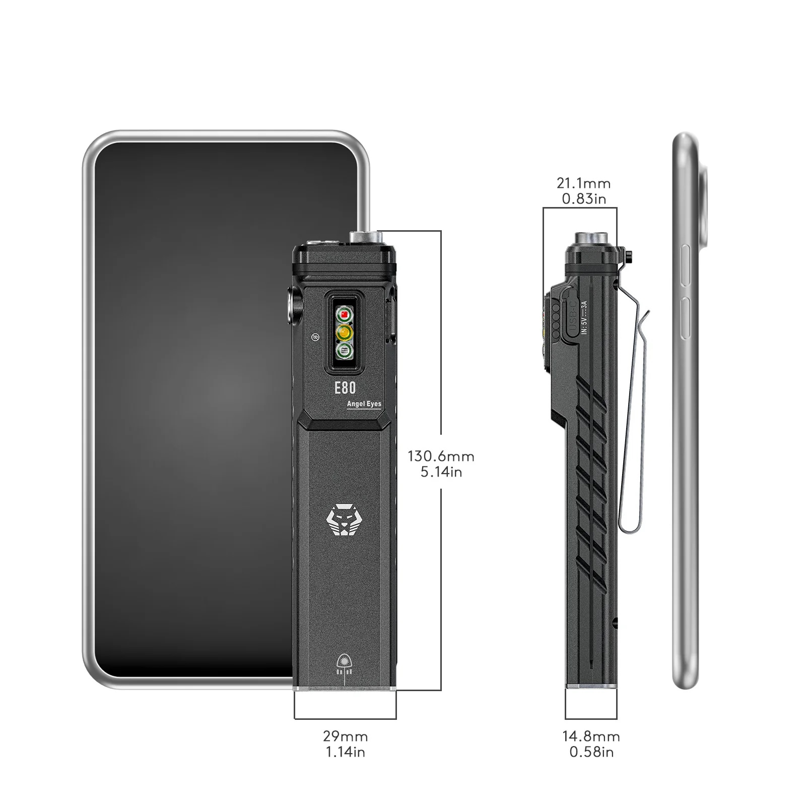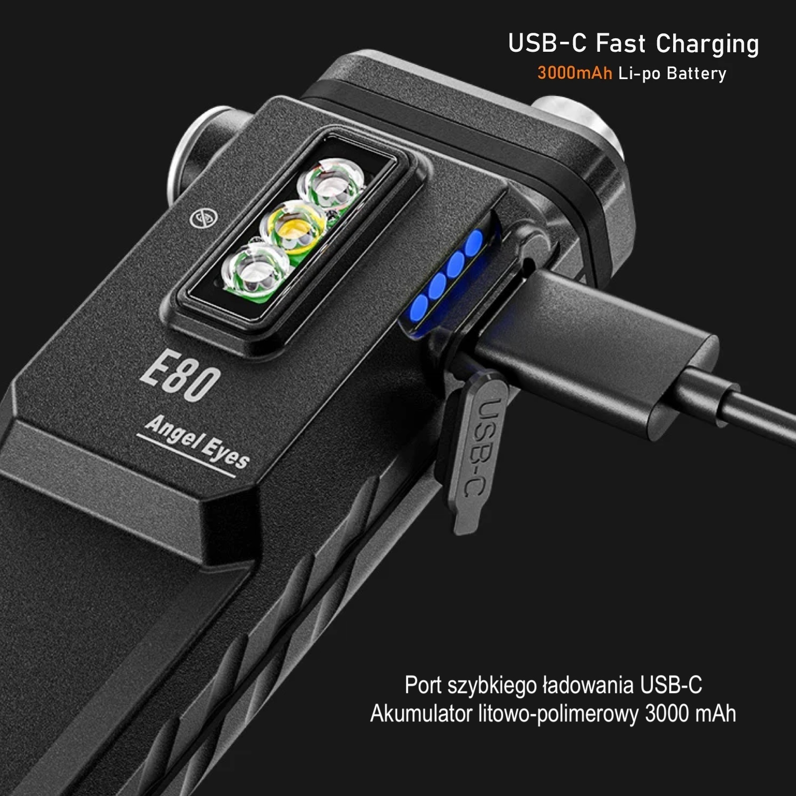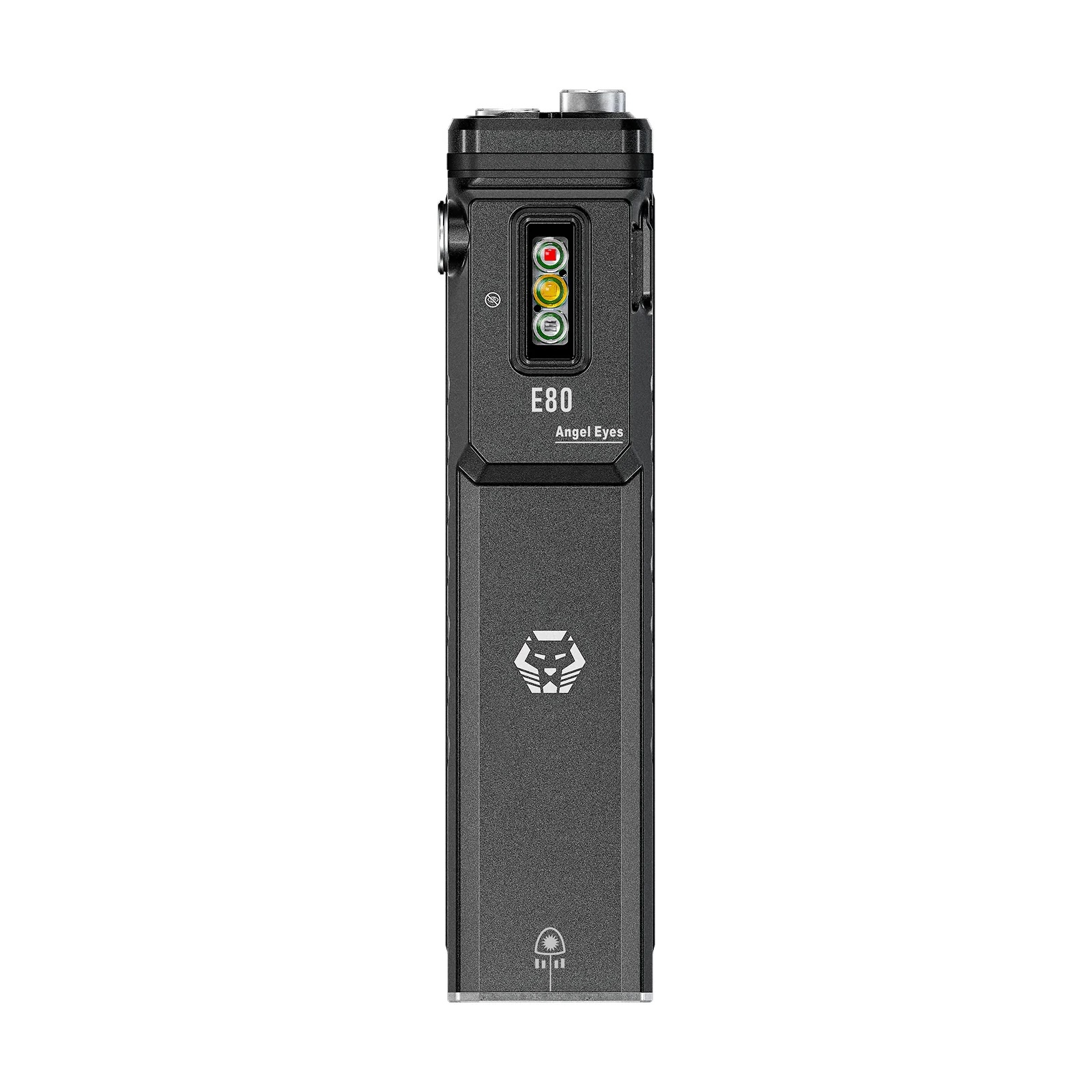 Latarka RovyVon Angel Eyes E80 7000K Cool White & Laser + White/Red/UV Black EDC Specjalistyczna Akumulator 1800 Lumenów to solidne i posiadające funkcje specjalne żródło światła. E80 oferuje: