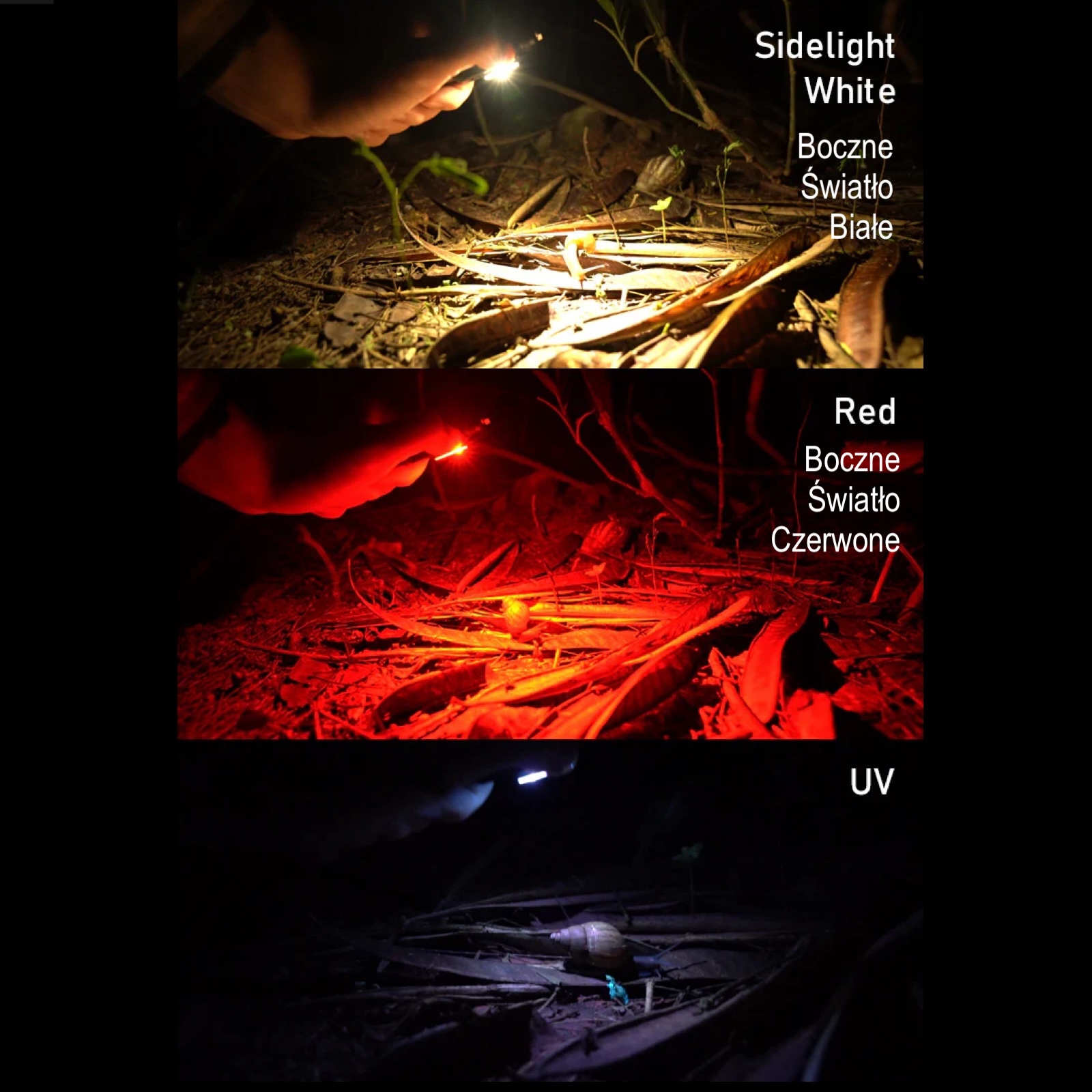 **BOCZNE OŚWIETLENIE SPECJALNE: ŚWIATŁO CZERWONE, BIAŁE I UW**: Na oświetlenie boczne składają się 3 diody LED, które dają 3 rodzaje światła: