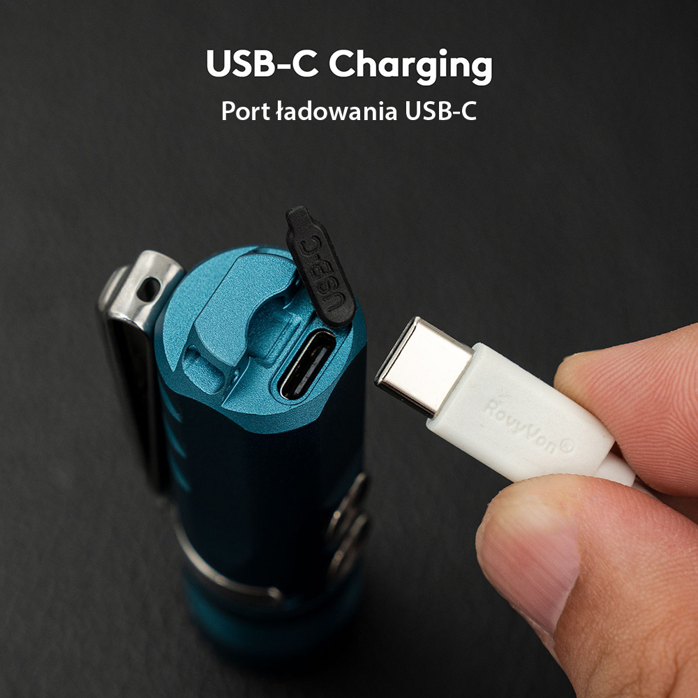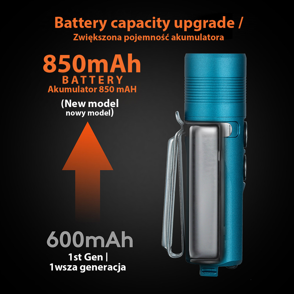 Akumulator i USB-C. Latarka posiada wydajny akumulator o pojemności maksymalnej 850 mAh (powiększony względem pierwszej generacji), co daje 152 h czasu pracy w najniższym trybie (Monlight). Ładowanie następuje po przez port USB-C. Latarka posiada wskaźnik procesu ładowania, oznajmiający pulsującym kolorem niebieskim trwanie procesu ładowania, a ciągłym kolorem zielonym, pełne naładowanie akumulatora. Kiedy akumulator jest na skraju wyczerpania wskaźnik zasygnalizuje rozładowanie świecąc się na kolor czerwony.
