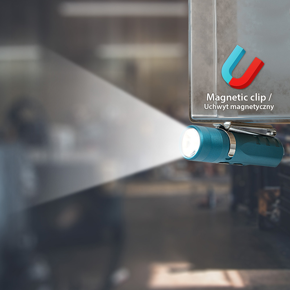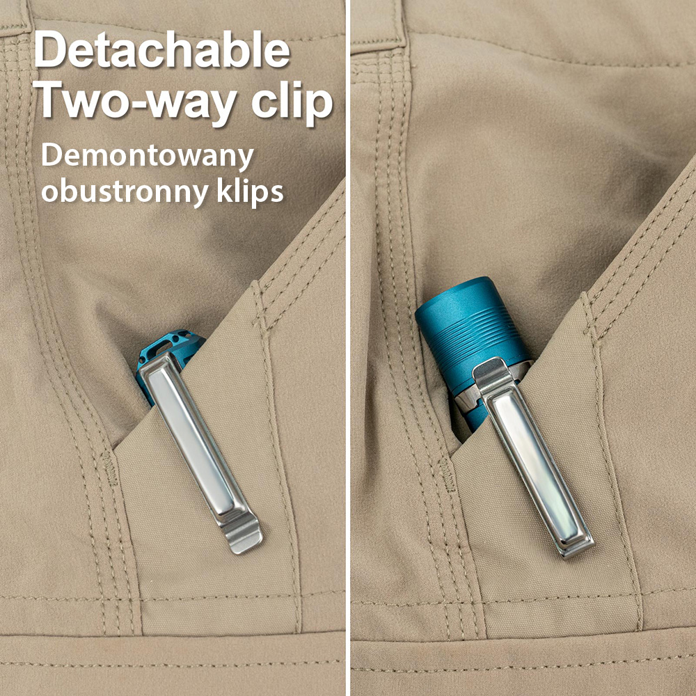 Klips stalowy. Montowany na latarce klips służy do jej przypięcia do elementu odzieży (kieszeni spodni, koszuli, rękawa), saszetki, torby, plecaka, itd. Umożliwia też przypięcie do czapki z daszkiem dając nam funkcję latarki czołowej. Jego konstrukcja sprawia, że latarkę można zamontować w obu kierunkach(diodą do przodu lub tyłu). Klips posiada też przystawkę magnetyczną by przyczepić latarkę do powierzchni metalowych.