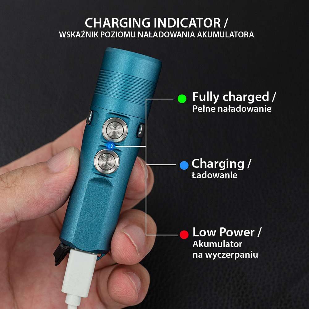 - 2) Kiedy napięcie w baterii spada poniżej 2,8 V, nie jest możliwe ponowne uruchomienie latarki, dopóki nie zostanie podpięta do ładowania.