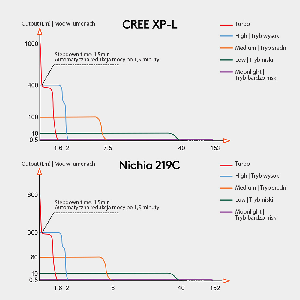 * i ** Po około minucie pracy w trybie Wysokim lub Średnim następuje automatyczne obniżenie mocy świetlnej do 100 lumenów. Jet to zabezpieczenie chroniące użytkownika przed nadmierną temperaturą a komponenty latarki przed przegrzaniem.