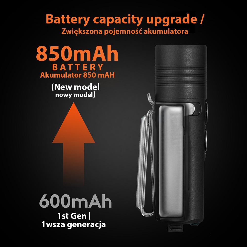 Akumulator i USB-C. Latarka posiada wydajny akumulator o pojemności maksymalnej 850 mAh (powiększony względem pierwszej generacji), co daje 152 h czasu pracy w najniższym trybie (Monlight). Ładowanie następuje po przez port USB-C. Latarka posiada wskaźnik procesu ładowania, oznajmiający pulsującym kolorem niebieskim trwanie procesu ładowania, a ciągłym kolorem zielonym, pełne naładowanie akumulatora. Kiedy akumulator jest na skraju wyczerpania wskaźnik zasygnalizuje rozładowanie świecąc się na kolor czerwony.