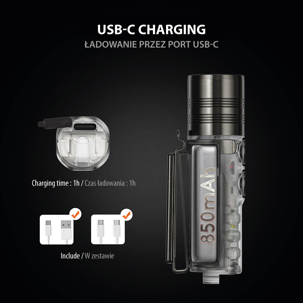 Akumulator i USB-C. Latarka posiada wydajny akumulator o pojemności maksymalnej 850 mAh co daje 152 h czasu pracy w najniższym trybie (Monlight). Ładowanie następuje po przez port USB-C. Latarka posiada wskaźnik procesu ładowania, oznajmiający pulsującym kolorem niebieskim trwanie procesu ładowania, a ciągłym kolorem zielonym, pełne naładowanie akumulatora. Kiedy akumulator jest na skraju wyczerpania wskaźnik zasygnalizuje rozładowanie świecąc się na kolor czerwony.