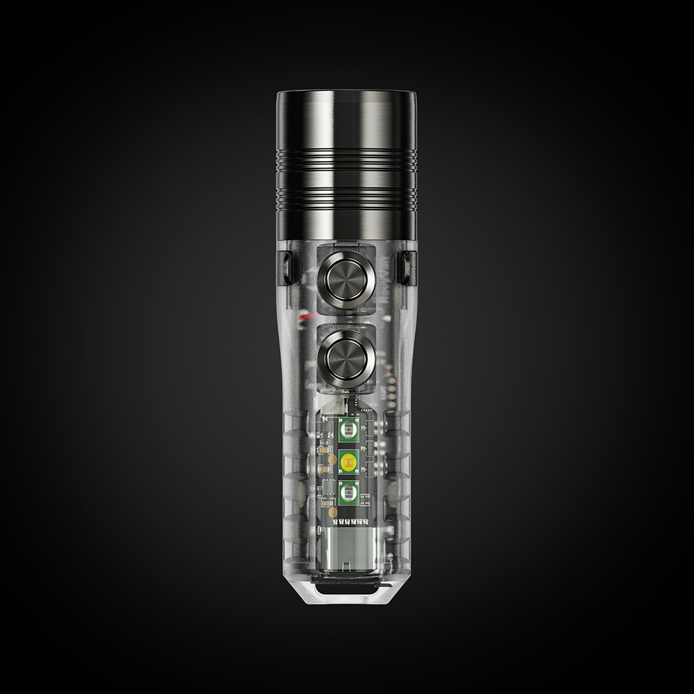 Akumulator i USB-C. Latarka posiada wydajny akumulator o pojemności maksymalnej 850 mAh co daje 152 h czasu pracy w najniższym trybie (Monlight). Ładowanie następuje po przez port USB-C. Latarka posiada wskaźnik procesu ładowania, oznajmiający pulsującym kolorem niebieskim trwanie procesu ładowania, a ciągłym kolorem zielonym, pełne naładowanie akumulatora. Kiedy akumulator jest na skraju wyczerpania wskaźnik zasygnalizuje rozładowanie świecąc się na kolor czerwony.