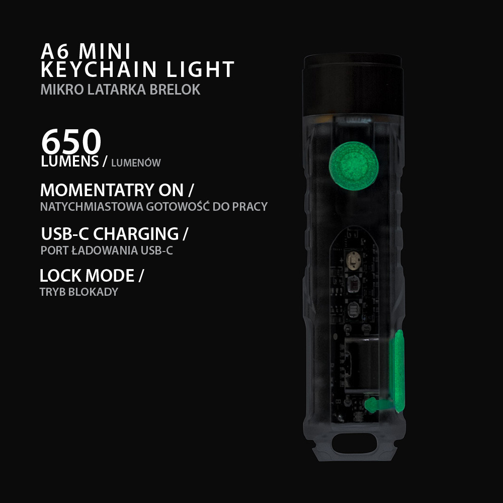 Prezentowana latarka Aurora A6 to wielofunkcyjna latarka EDC. Wykonana została z wytrzymałego poliwęglanu, a jej maksymalna moc świetlna to aż 650 lumenów. Latarkę ładuje się przez złącze USB-C a akumulator ma pojemność 330 mAh (72 h pracy w Trybie Moonlight). Zaślepka portu USB-C oraz przycisk są fluroscencyjne.