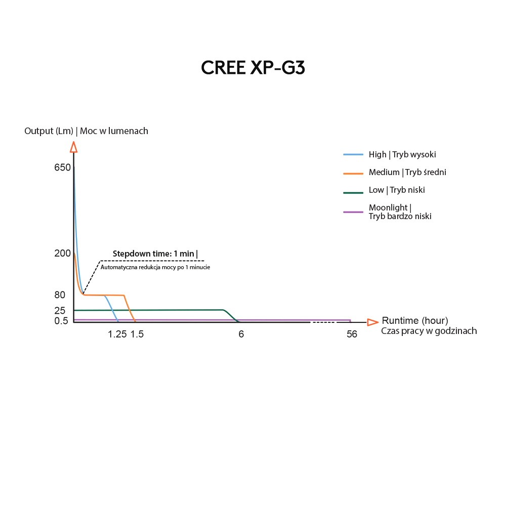 * i ** Po około minucie pracy w trybie Wysokim lub Średnim następuje automatyczne obniżenie mocy świetlnej do 80 lumenów. Jet to zabezpieczenie chroniące użytkownika przed nadmierną temperaturą a komponenty latarki przed przegrzaniem.