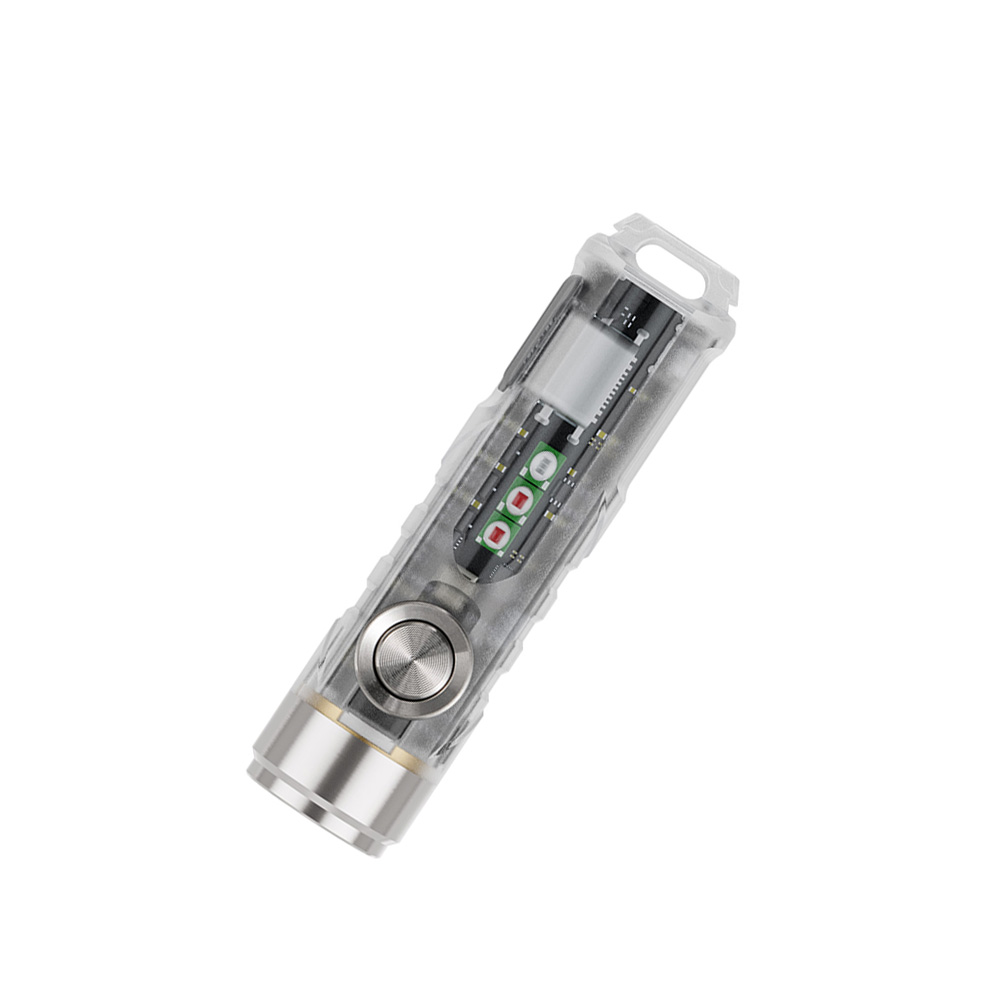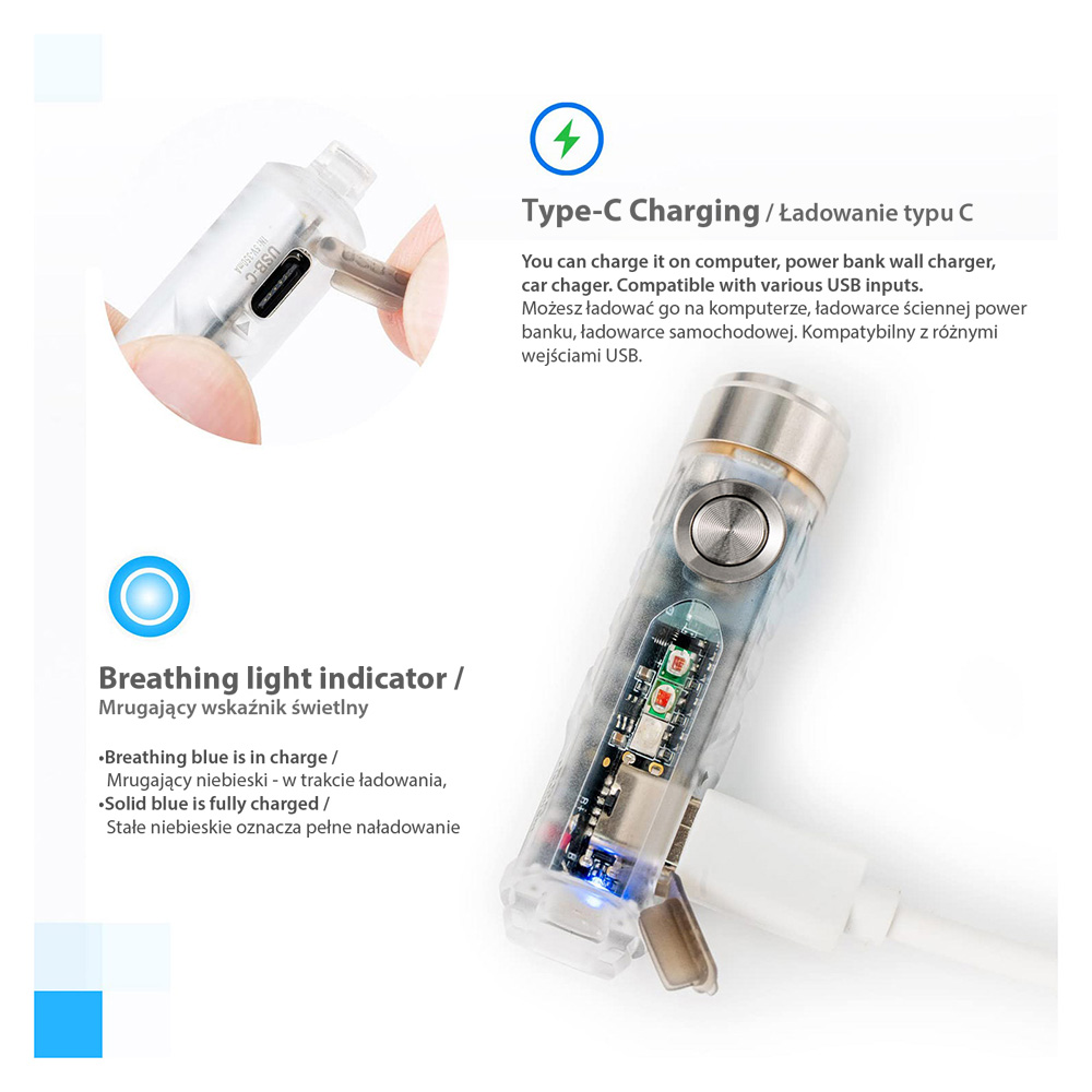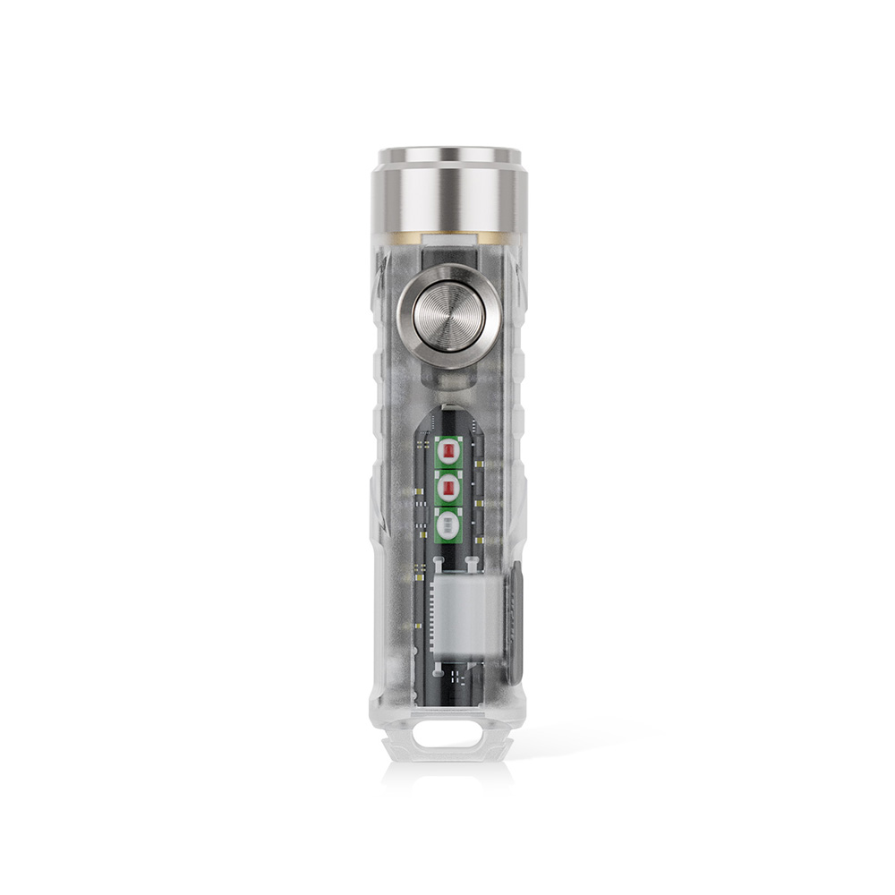 Akumulator i USB-C. Latarka posiada wydajny akumulator o pojemności maksymalnej 330 mAh, co daje 72 h czasu pracy w najniższym trybie (Monlight). Ładowanie następuje po przez port USB-C. Latarka posiada wskaźnik procesu ładowania, oznajmiający pulsującym kolorem niebieskim trwanie procesu ładowania, a ciągłym kolorem zielonym, pełne naładowanie akumulatora. Kiedy akumulator jest na skraju wyczerpania wskaźnik zasygnalizuje rozładowanie świecąc się na kolor czerwony.