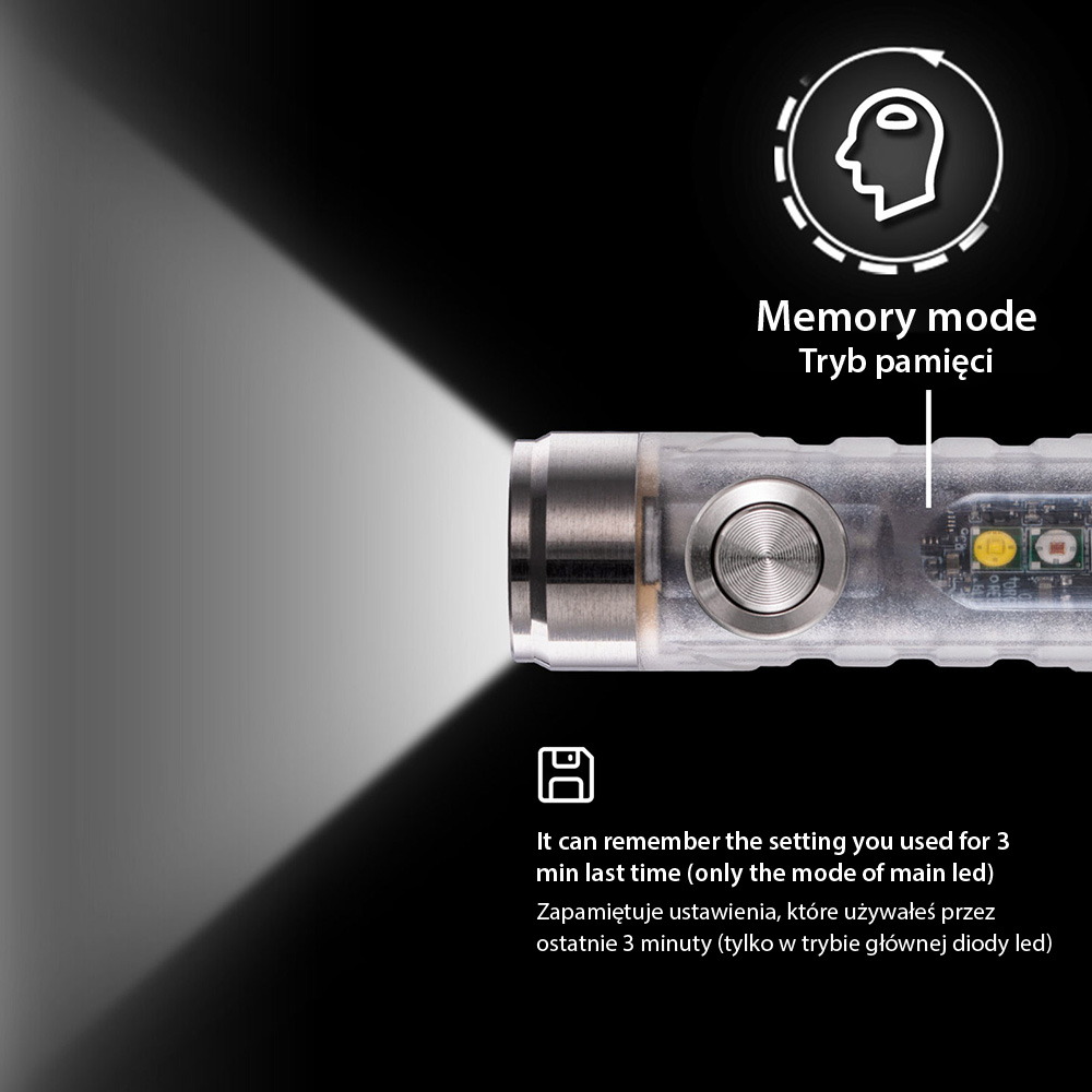 - * Funkcja pamięci: praca w danym trybie minimalnie 3 minuty powoduje zapamiętanie trybu i przy kolejnym włączeniu latarki uruchomienie właśnie w tym trybie.