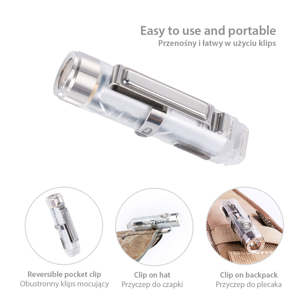 Klips stalowy. Montowany na latarce klips służy do jej przypięcia do elementu odzieży (kieszeni spodni, koszuli, rękawa), saszetki, torby, plecaka, itd. Umożliwia też przypięcie do czapki z daszkiem dając nam funkcję latarki czołowej. Klips można przekładać na korpusie, dzięki czemu mamy możliwość skierowania strumienia świetlnego w pożądanym kierunku. Klips posiada także przystawkę magnetyczną, która pozwoli montować latarkę na metalowych powierzchniach.