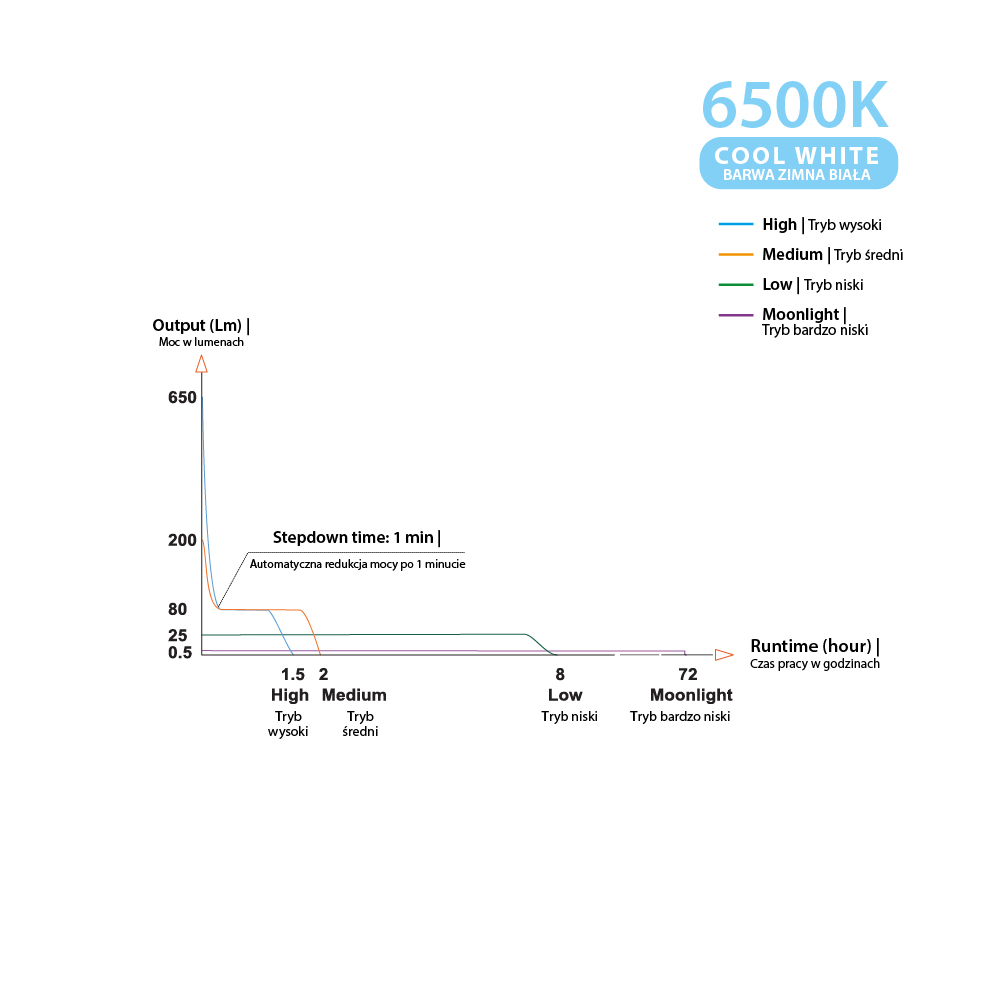 - Wysoki (High)*: 650 lumenów,
