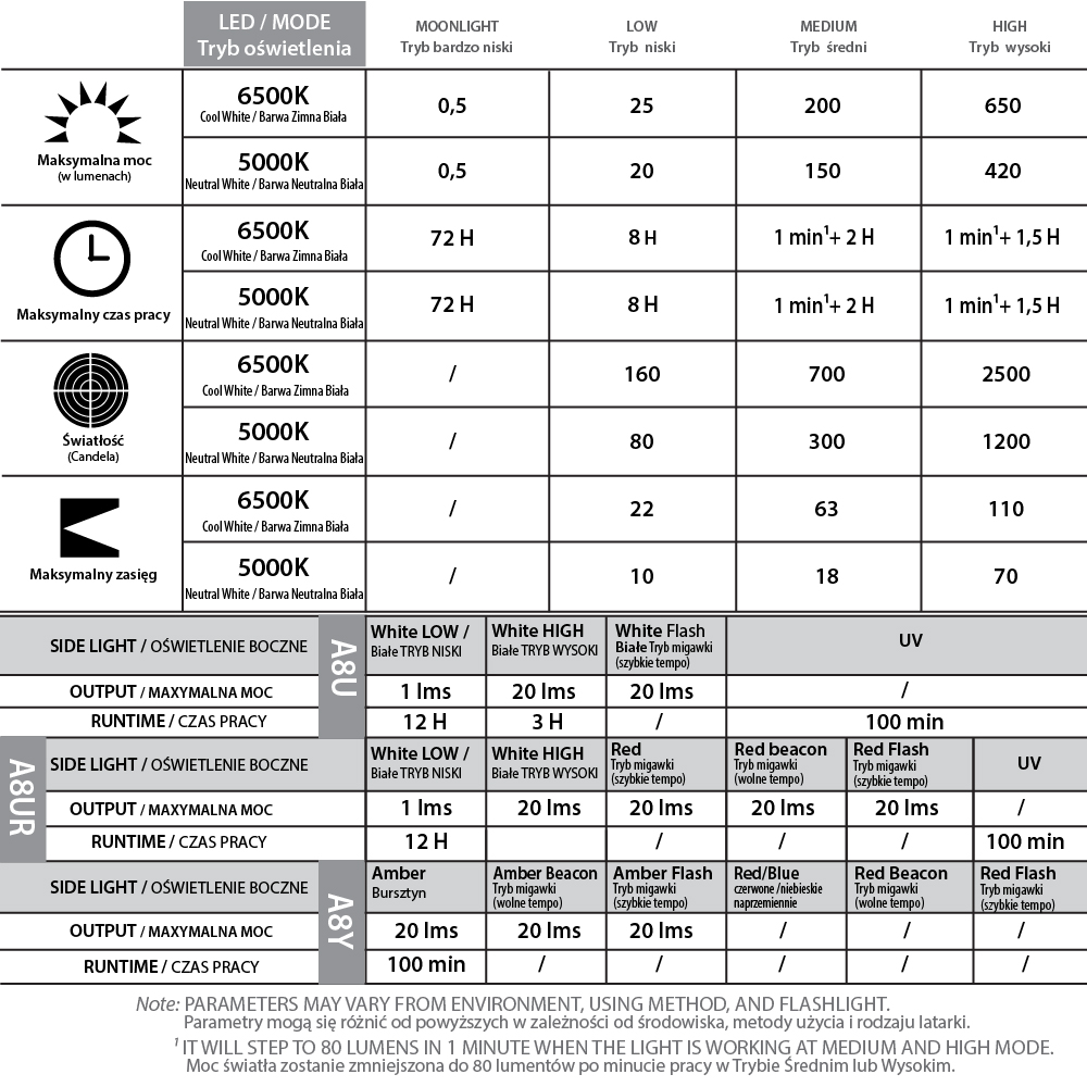 * i ** Po około minucie pracy w trybie Wysokim lub Średnim następuje automatyczne obniżenie mocy świetlnej do 80 lumenów. Jet to zabezpieczenie chroniące użytkownika przed nadmierną temperaturą a komponenty latarki przed przegrzaniem.