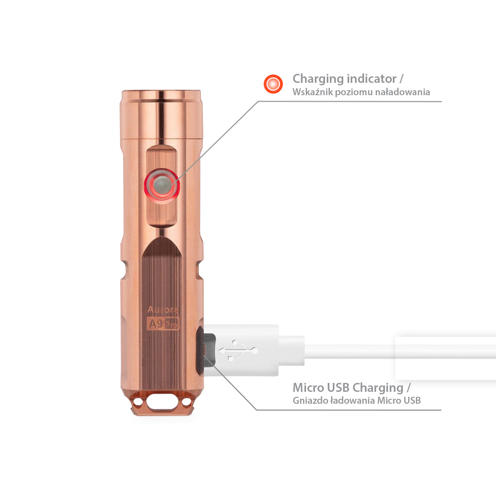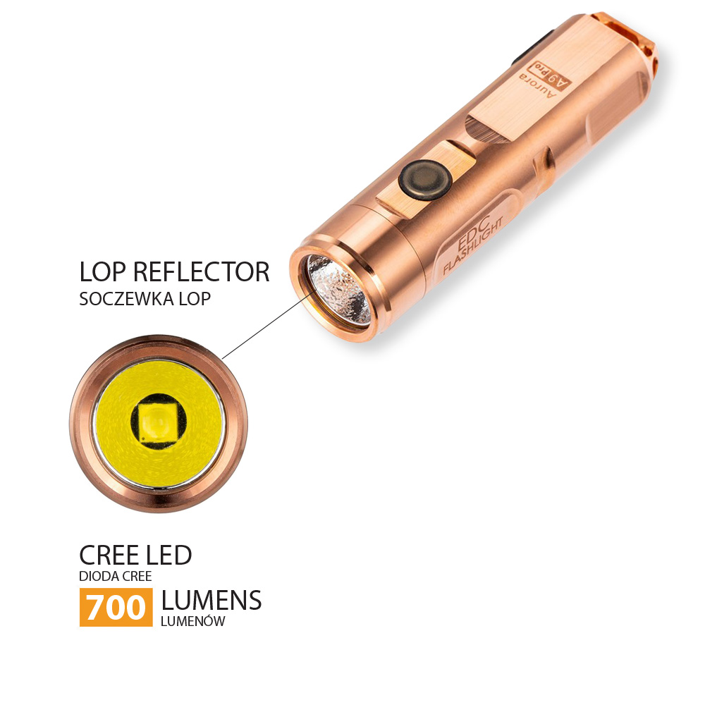 Prezentowana latarka Aurora A9 Pro Copper 700 Lumenów wykonana została z miedzi, a jej maksymalna moc świetlna to aż 700 lumenów. Latarkę ładuje się przez złącze micro-USB a akumulator ma pojemność 330 mAh (35 h pracy w Trybie Moonlight).