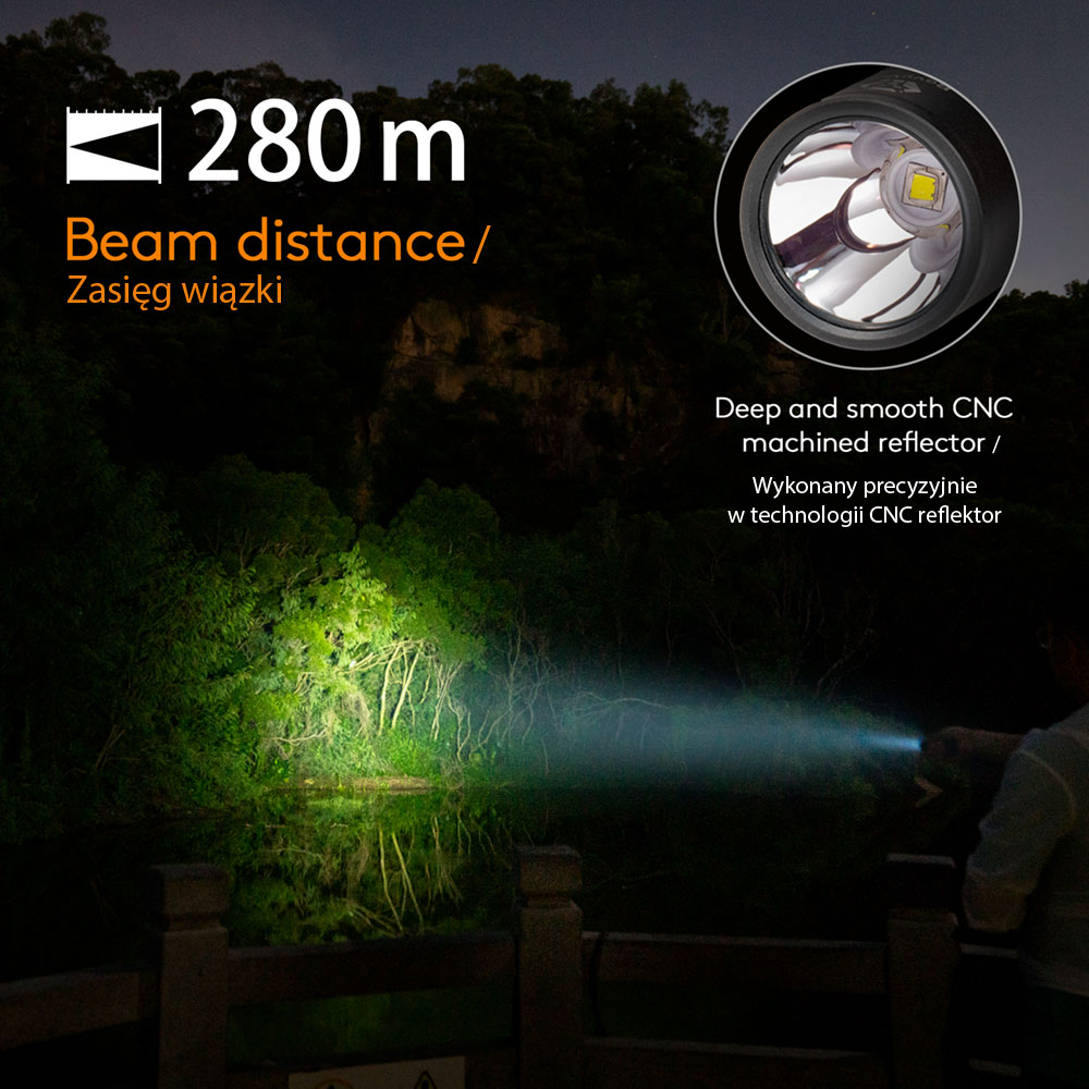 Oryginalna dioda Luminus SST-40 stosowana w latarce GL7 w połączeniu z wydajną soczewką kierującą daleki i wąski strumień świetlny zapewnia zasięg aż do 280 metrów.