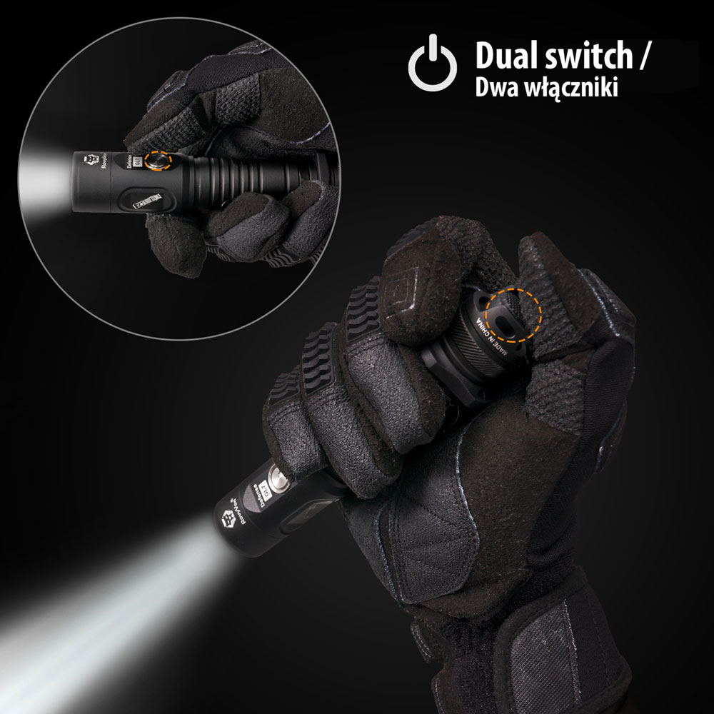 Latarkę obsługuje się jedną ręką, włączanie i wyłączanie następuje za sprawą przycisku bocznego znajdującego się na obudowie lub gumowanego przycisku tylnego. Przycisk tylny służy do uruchamiania najbardziej potrzebnych funkcji taktycznych.