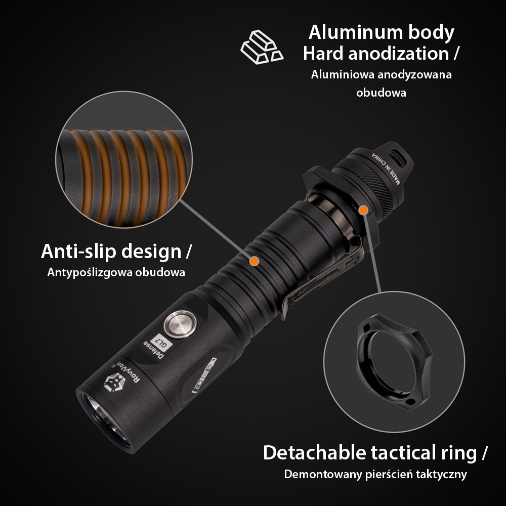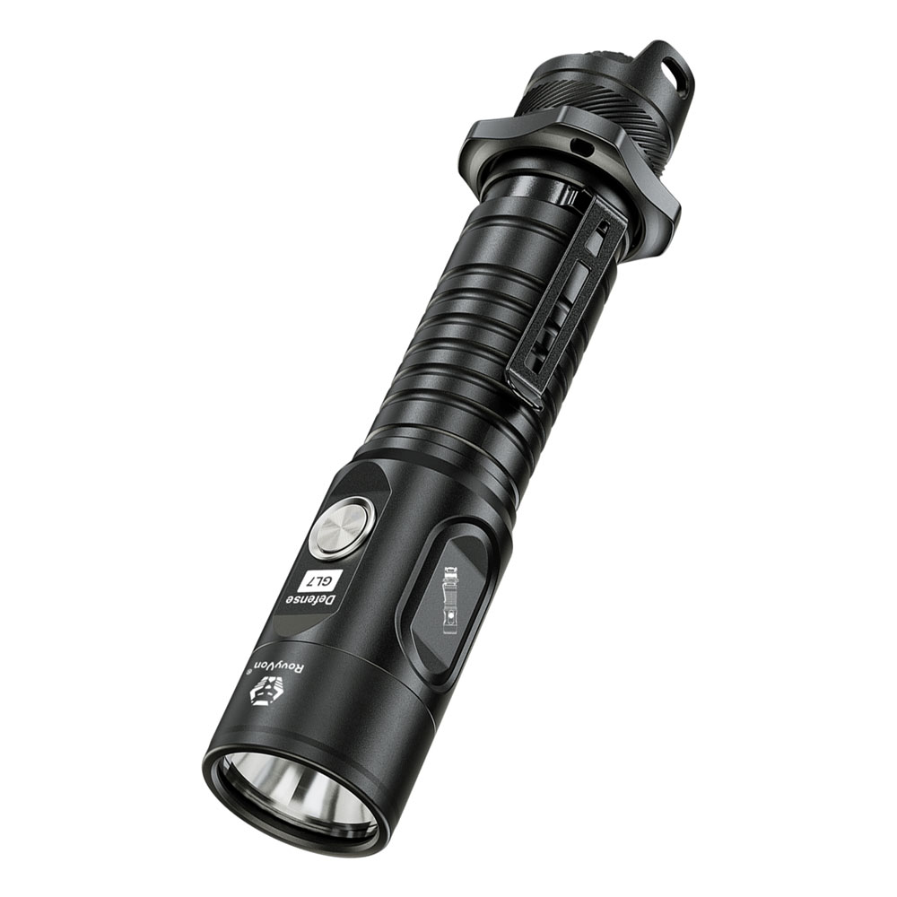 Latarka RovyVon GL7 Czarna Taktyczna 2000 Lumenów Akumulator 18650 to latarka z linii latarek taktycznych. Jest to solidne i niezawodne źródło światła, które można wykorzystać zarówno w trakcie rekreacji, jak też w środowisku pracy. Przez wzgląd na budowę sposób obsługi oraz funkcje jest to latarka przydatna dla służb mundurowych i osób oczekujących czegoś więcej od codziennej latarki.