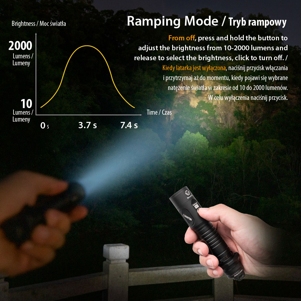 - 5. Tryb rampowy: kiedy latarka jest wyłączona należy wcisnąć przycisk boczny i przytrzymać aż do momentu, w którym moc świetlna ustawi się na pożądanym poziomie. Wówczas należy puścić przycisk. Ustawienia można dokonać w zakresie 10-1500 lumenów.