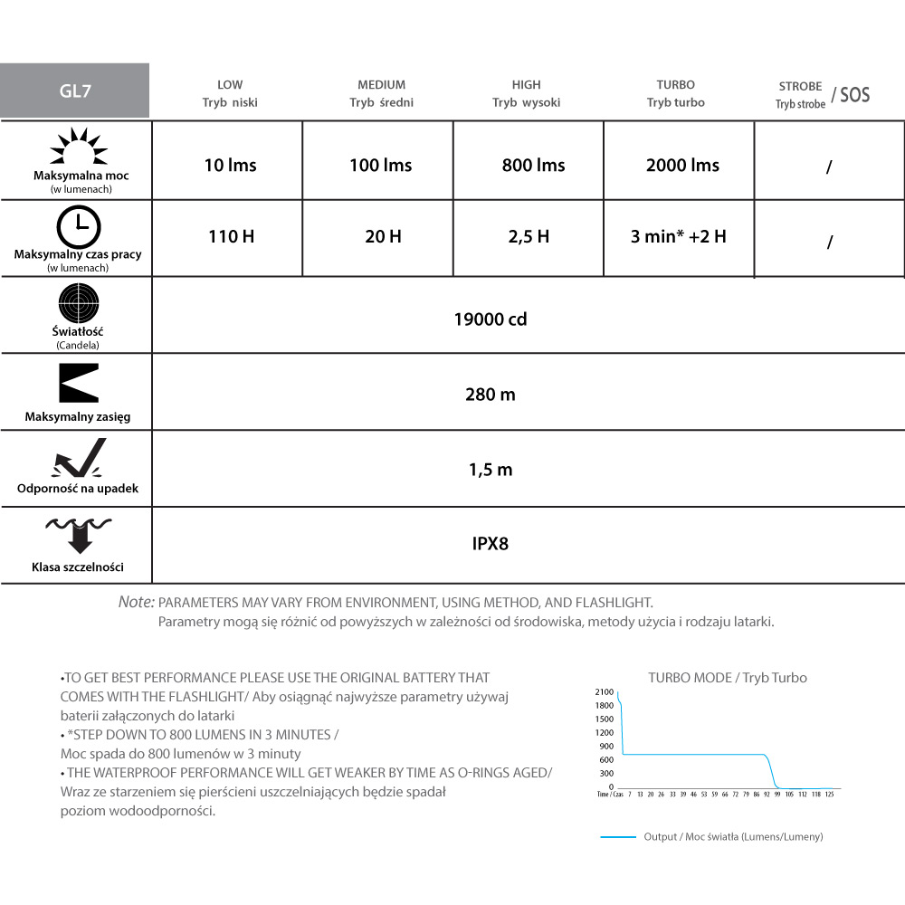 - *Kiedy latarka pracuje w trybie Turbo, moc świetlna zmniejszy się do wartości 800 lumenów w ciągu 3 minut aby nie przegrzać komponentów i nie uszkodzić latarki.