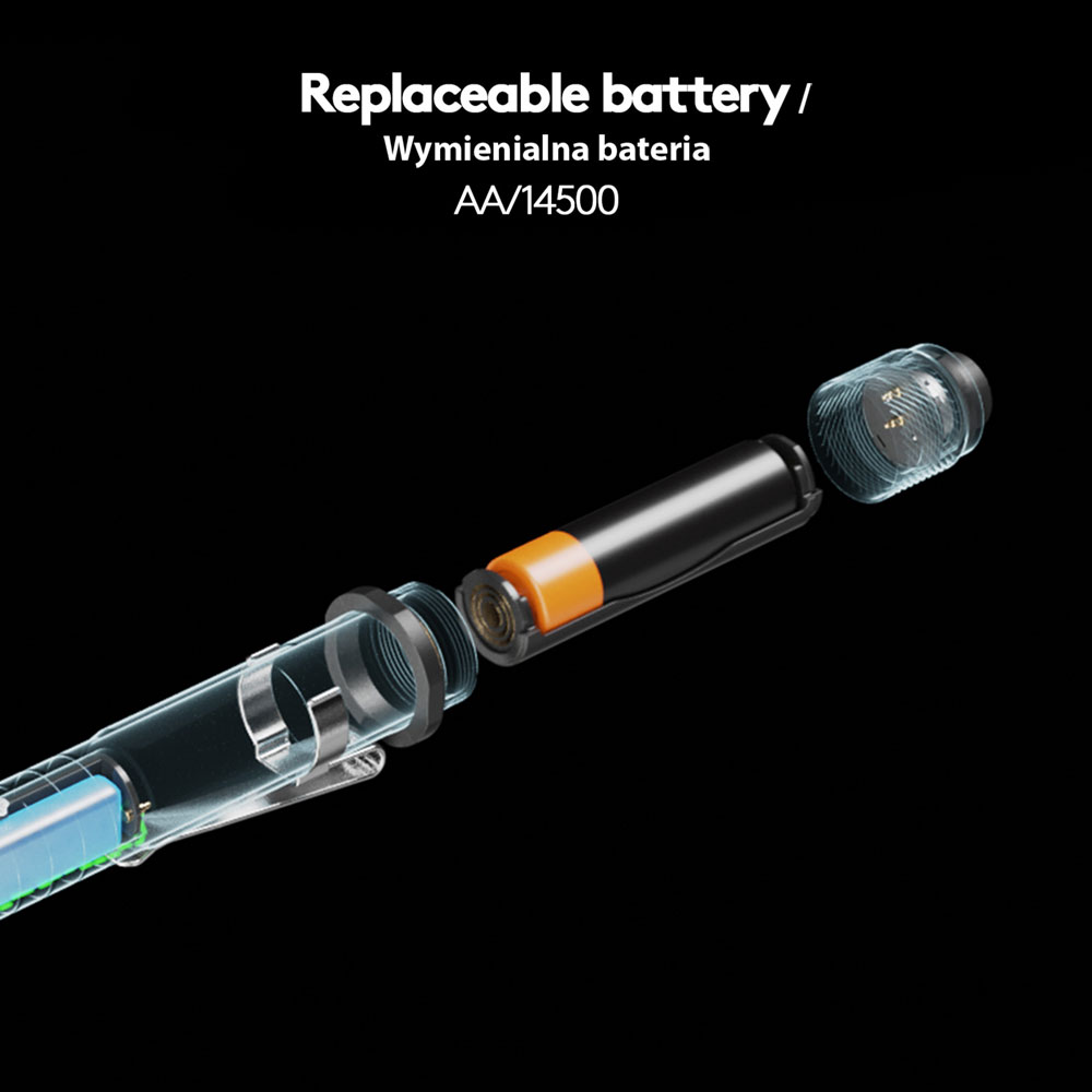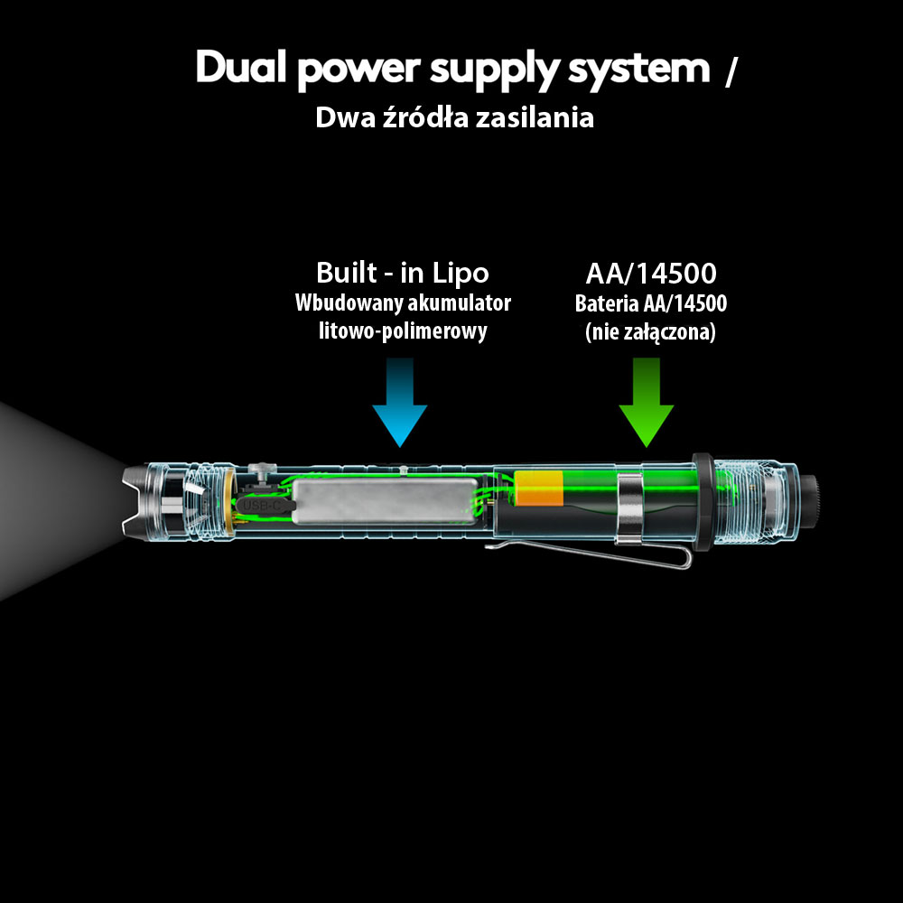 Latarka Hybrid H3 Pro to latarka hybrydowa z dwoma opcjami zasilania. Latarka posiada na stałe wbudowany akumulator litowo-polimerowy o pojemności 330 mAh, ładowalny po przez złącze szybkiego ładowania USB-C. Latarka posiada dodatkową komorę na standardowe baterie AA (baterie alkaliczne 1,5 V lub wymienne akumulatory 1,2 V NiMH) lub wymienne akumulatorki litowo-jonowe 14500, które stanowią dodatkowa opcję zasilania. Po wyczerpaniu się akumulatora, automatycznie włącza się zasilanie z baterii. Którą opcję zasialania w danym momencie stosować można oczywiście również wybrać.