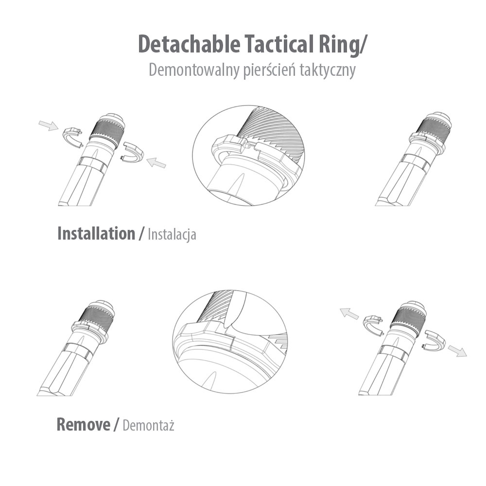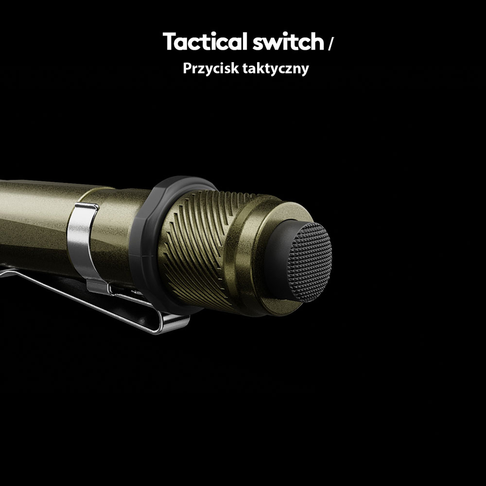 Latarkę obsługuje się jedną ręką, włączanie i wyłączanie następuje za sprawą przycisku bocznego znajdującego się na obudowie lub gumowanego przycisku tylnego. Przycisk boczny służy do uruchamiania najbardziej potrzebnych funkcji taktycznych.