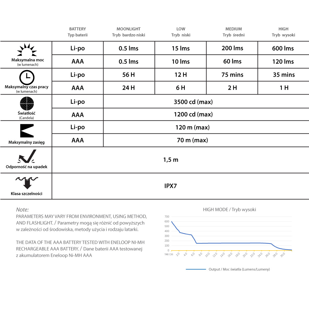 MAKSYMALNA MOC: 600 lumenówAKUMULATOR: Litowo-polimerowy
