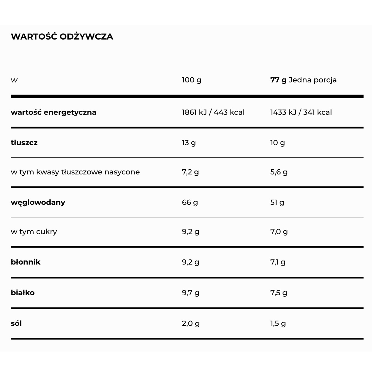 - Wartość energetyczna porcji 77 g: 1433 kJ / 341 kcal