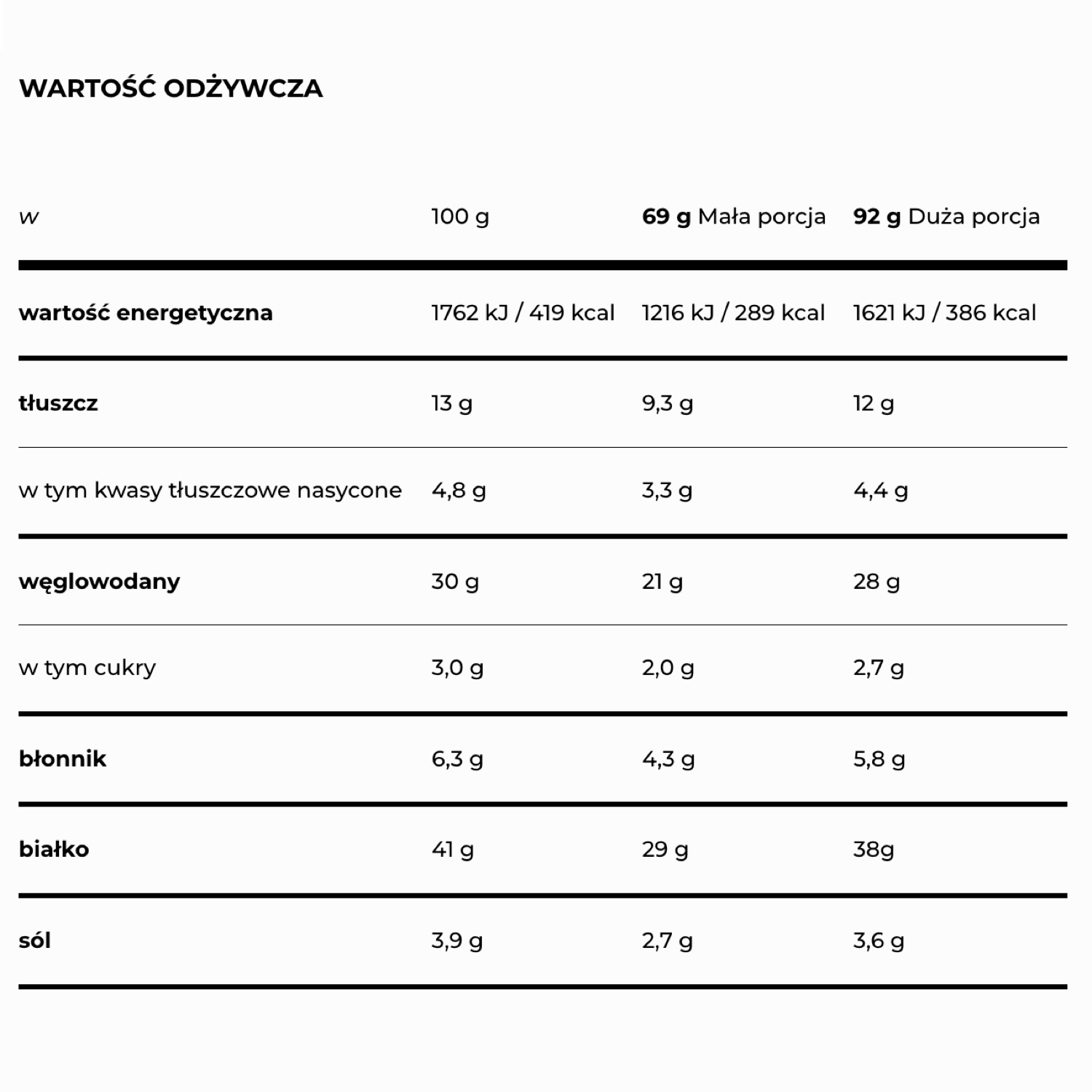- tłuszcz: 13 g, w tym kwasy tłuszczowe nasycone: 4,8 g