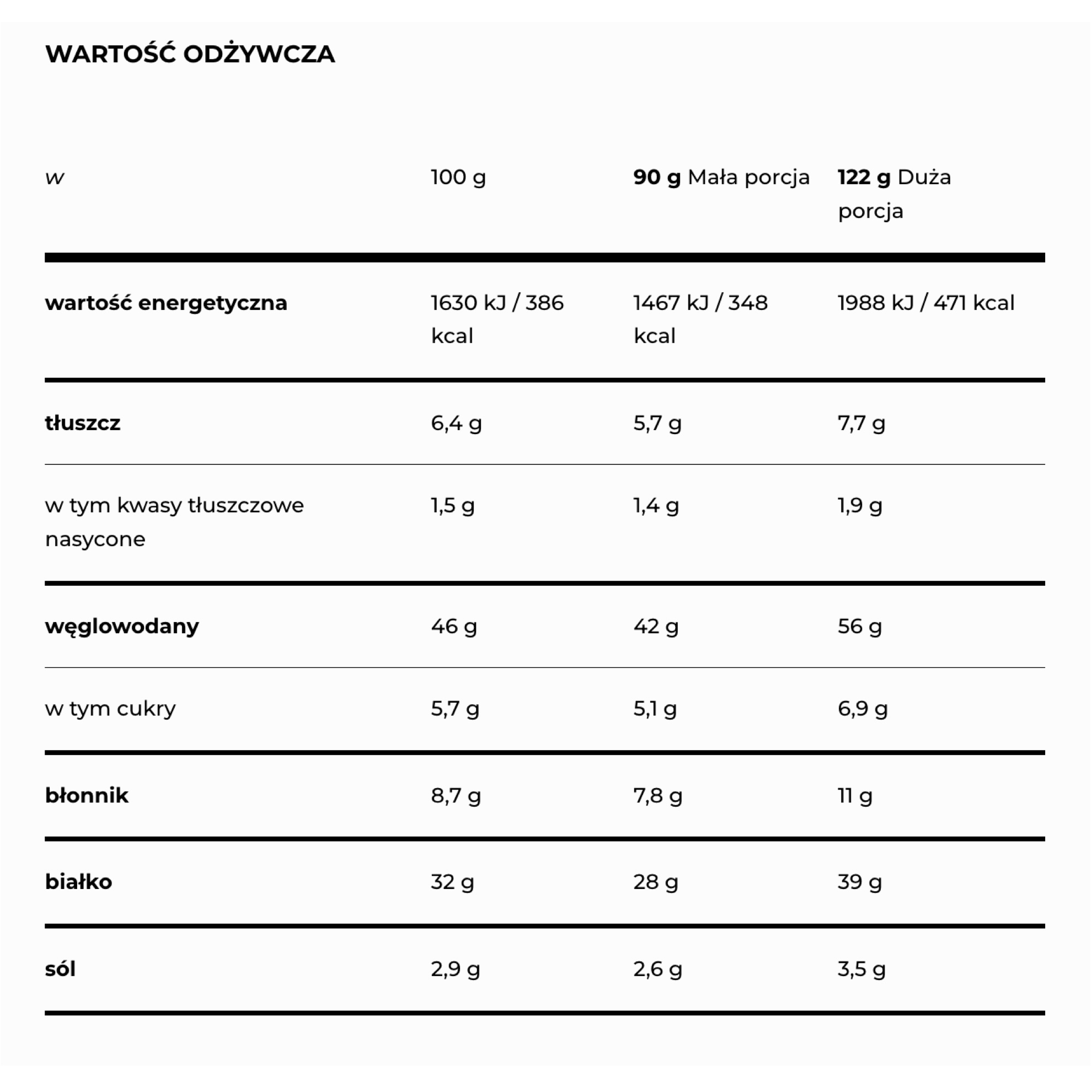 - Wartość energetyczna porcji 90 g: 1467 kJ / 348 kcal