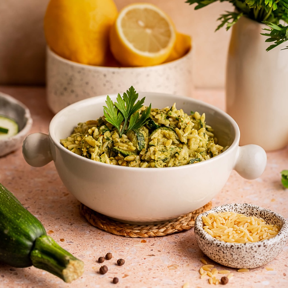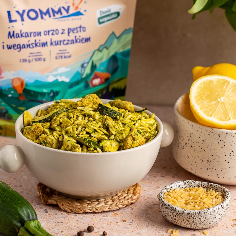 LYOMMY Makaron orzo z pesto i wegańskim kurczakiem to roślinne danie o kremowym, ziołowym charakterze, oparte na delikatnym makaronie orzo połączonym z intensywnie zielonym pesto przygotowanym z natki pietruszki, bazylii oraz orzechów nerkowca. Kompozycję dopełnia kokosowa śmietana podkreślająca aksamitną strukturę sosu, subtelna nuta soku z cytryny oraz wegański odpowiednik kurczaka na bazie białka grochu, tworząc harmonijną całość o wyrazistym, świeżym profilu smakowym.