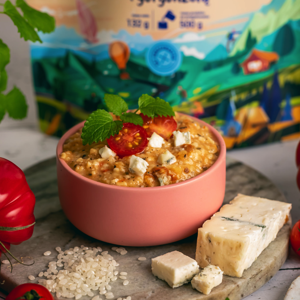 LYOMMY Risotto z pomidorami i gorgonzolą to bezmięsne danie przygotowane na bazie ryżu arborio, wyróżniające się intensywnie pomidorowym profilem smakowym. Połączenie suszonych pomidorów i pulpy pomidorowej uzupełnia wyrazisty włoski ser gorgonzola, nadający potrawie charakterystyczną głębię aromatu. Dzięki wysokiej kaloryczności danie stanowi pełnowartościową propozycję wspierającą regenerację i dostarczającą energii podczas aktywności w terenie.