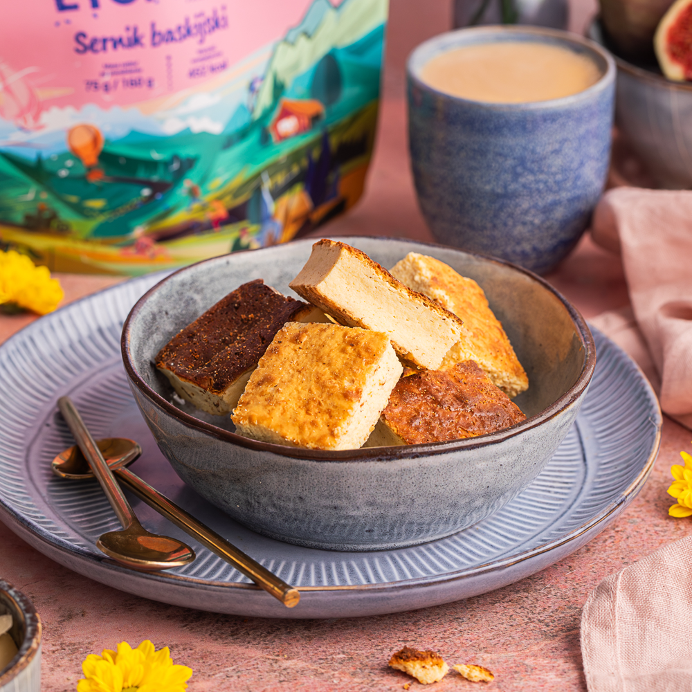 LYOMMY Sernik baskijski to deser liofilizowany inspirowany klasycznym sernikiem baskijskim, przygotowany na bazie kremowego serka śmietankowego o delikatnej, gładkiej strukturze. Po odpowiednim przygotowaniu deser zachowuje kremową konsystencję i charakterystyczny smak, dzięki czemu sprawdza się jako słodka propozycja po wysiłku, w podróży lub jako dodatek do kawy.