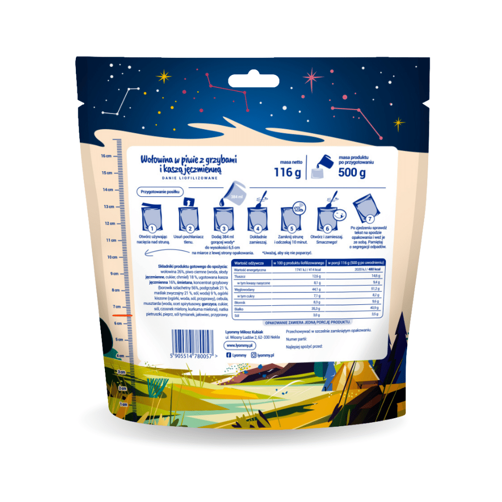 LYOMMY Wołowina w piwie z grzybami i kaszą jęczmienną to pierwsze dostępne na rynku danie liofilizowane przygotowane na bazie piwa, w którym wysokobiałkowa wołowina jest długo gotowana w ciemnym piwie, zyskując wyjątkową delikatność i głęboki aromat. Kompozycję uzupełniają grzyby i jałowiec nadające całości leśny charakter oraz dodatek ogórka kiszonego, musztardy, śmietany i natki pietruszki, które wprowadzają lekko kwaskowe, zbalansowane wykończenie smaku.