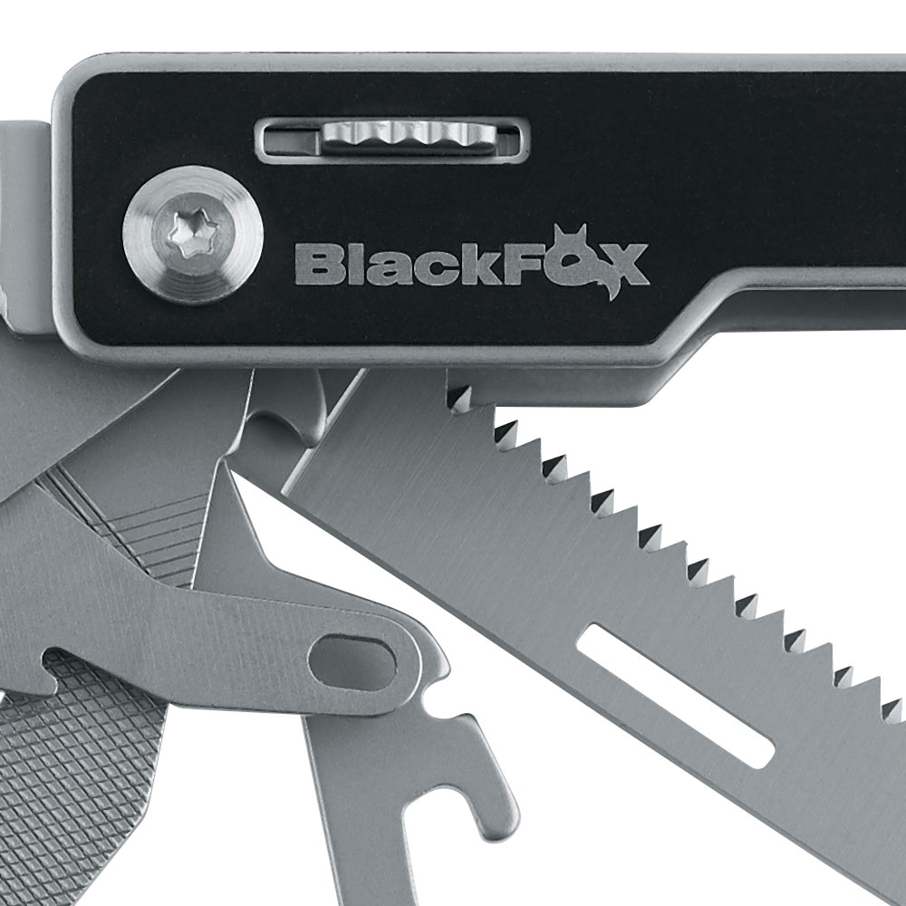 Multitool posiada sprężynującą, ustawiającą się samoczynnie po otwarciu któregokolwiek z narzędzi blokadę. Blokada zapobiega niekontrolowanemu zamknięciu się używanego w danym momencie narzędzia.NAZWA: Multitool Black FOX BF-205