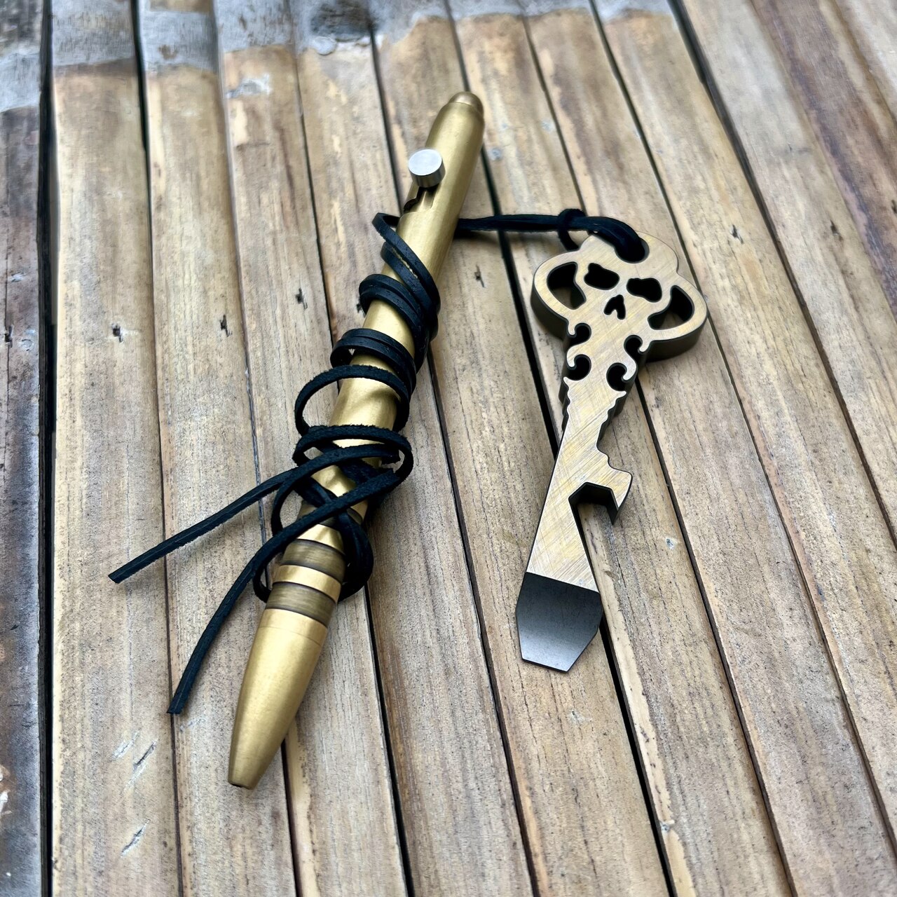 Multitool Chaves Knives Łom Otwieracz Klucz tytanowy CrossHatch BRONZE to kompaktowe narzędzie wykonane z anodyzowanego na kolor brązu tytanu, z wykończeniem crosshatch (przecinające się linie), posiadające wiele zastosowań. Może być brelokiem lub gustowną zawieszką na szyję. Jego podstawowe funkcje to łom, otwieracz do butelek, klucz płaski 1/4″ oraz śrubokręt. Charakterystyczny dla producenta motyw czaszki wpisany jest w kształt klucza.