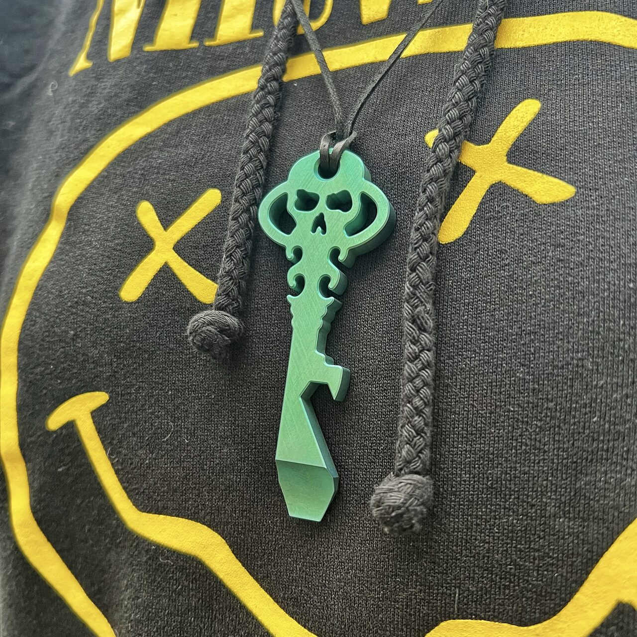 Multitool wykonany został z jednego kawałka antymagnetycznego, lekkiego a jednocześnie bardzo wytrzymałego tytanu, w kolorze zielonym. Materiał ten jest znacznie bardziej wytrzymały od stali a jednocześnie dużo od niej lżejszy co w przypadku tego typu narzędzia nie jest bez znaczenia. Motyw czaszki jest typowym dla tego producenta znakiem rozpoznawczym a samo narzędzie ma kształt klucza z otworem, dzięki któremu możemy przypiąć go do pęku kluczy od domu, stworzyć gustowny i przydatny brelok przy kluczyku samochodowym albo użyć jako zawieszki na szyję.