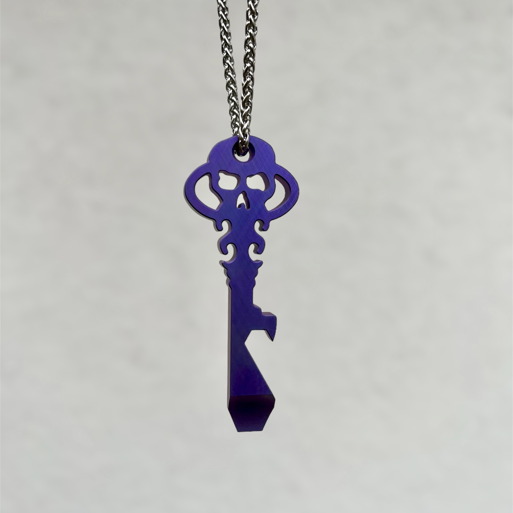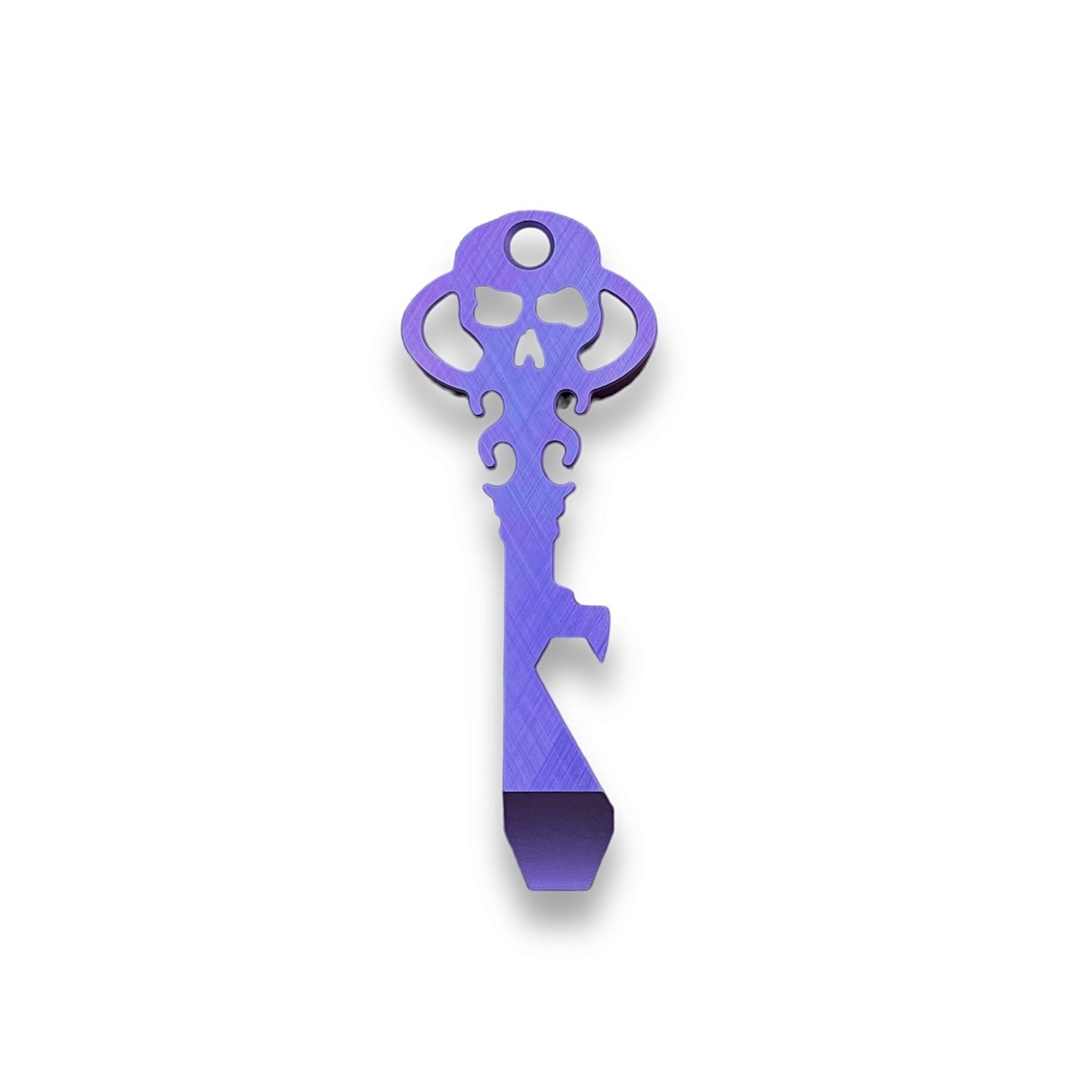 Multitool Chaves Knives Łom Otwieracz Klucz tytanowy CrossHatch High Voltage PURPLE to kompaktowe narzędzie wykonane z anodyzowanego na kolor fioletowy tytanu, z wykończeniem crosshatch (przecinające się linie), posiadające wiele zastosowań. Może być brelokiem lub gustowną zawieszką na szyję. Jego podstawowe funkcje to łom, otwieracz do butelek, klucz płaski 1/4″ oraz śrubokręt. Charakterystyczny dla producenta motyw czaszki wpisany jest w kształt klucza.