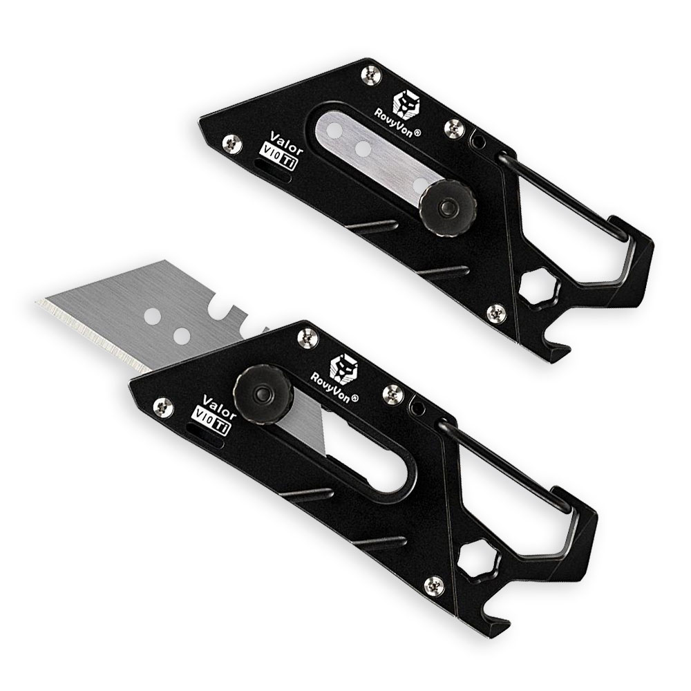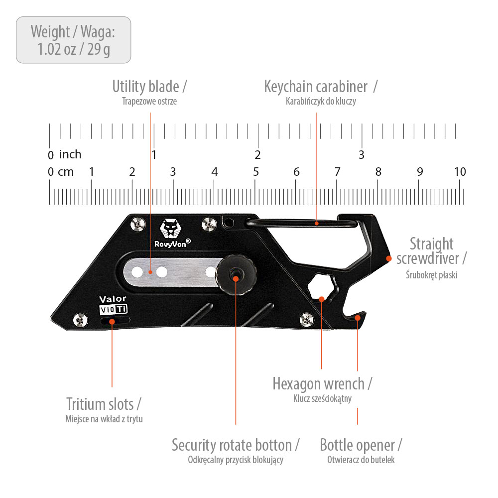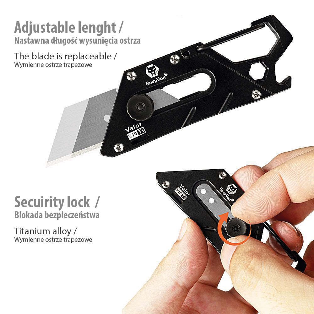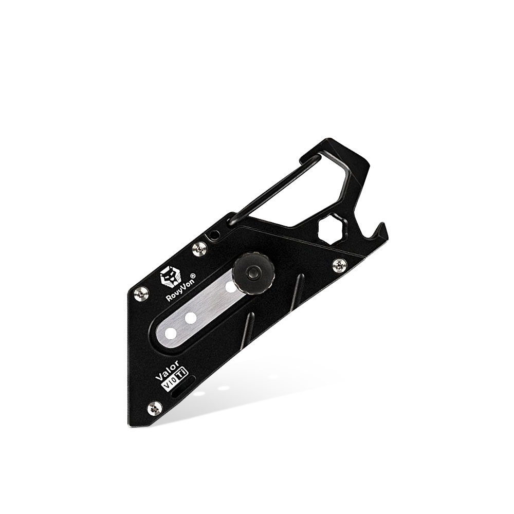 Multitool RovyVon Valor V10 Titanium PVD Black Multi-purpose Utility Tool | Nóż i Narzędzie Wielofunkcyjne. Multitool wykonany z ekstremalnie wytrzymałego tytanu posiadający przypięcie w postaci karabińczyka, dzięki czemu może być zawsze „pod ręką”, przypięty do kluczy, saszetki, plecaka itd.