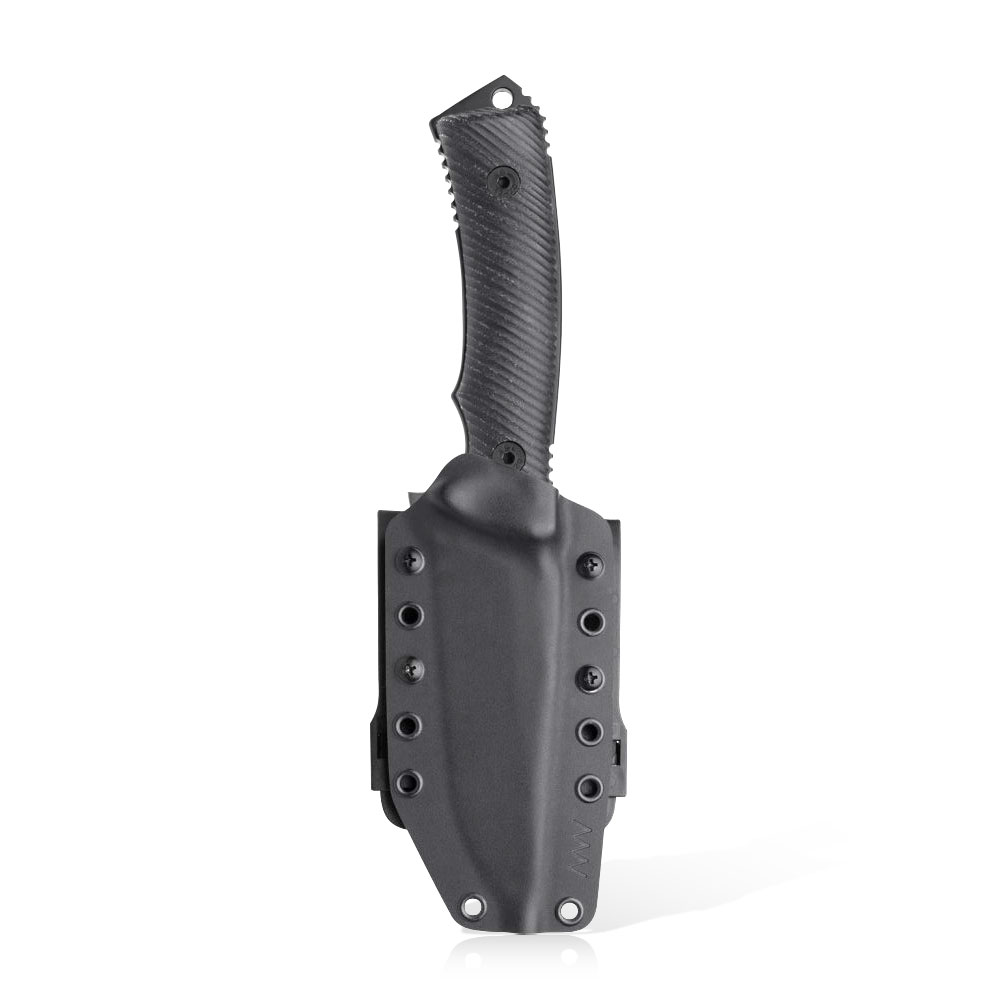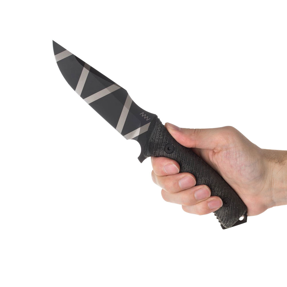 Ciemna trójwymiarowa rączka uformowana została z oryginalnego materiału Micarta. Dzięki doskonałemu wyprofilowaniu dopasowanemu do kształtu dłoni oraz chropowatej strukturze (rowki) chwyt noża jest mocny i stabilny w każdej sytuacji. Nóż jest wyposażony w bezpieczną pętlę ochronną z paracordu, która zapobiega jego wypadaniu z ręki podczas energicznego cięcia. Cała konstrukcja jest utrzymywana razem przez połączenie solidnych gwintowanych tulei i czterech śrub M5, również z wykończeniem DLC. Rękojeść zakończona została wybijakiem do szyb, w którym znajdziemy otwór na wyżej wspomnianą linkę.