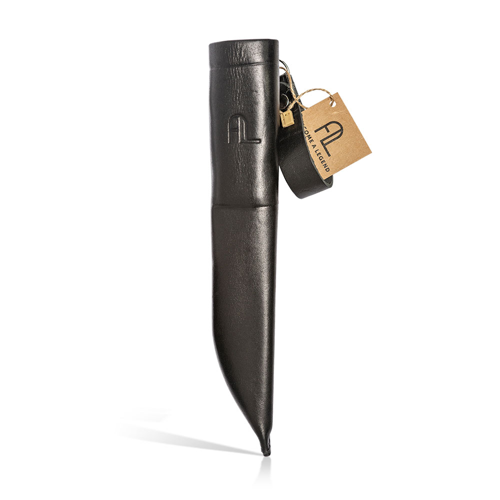 W zestawie z nożem otrzymujemy kaburę wykonaną ze skóry. Jest to klasyczne rozwiązanie pasujące stylem do narzędzia w niej się znajdującego. Drewno i skóra od zawsze stanowią idealne połączenie. Podobnie jak sam nóż, pochwa wykonana jest ręcznie, ma wysoki profil i chowa w sobie część rękojeści by lepiej zabezpieczać nóż przed wypadnięciem. Mocowana jest tradycyjnie do pasa w pozycji pionowej.