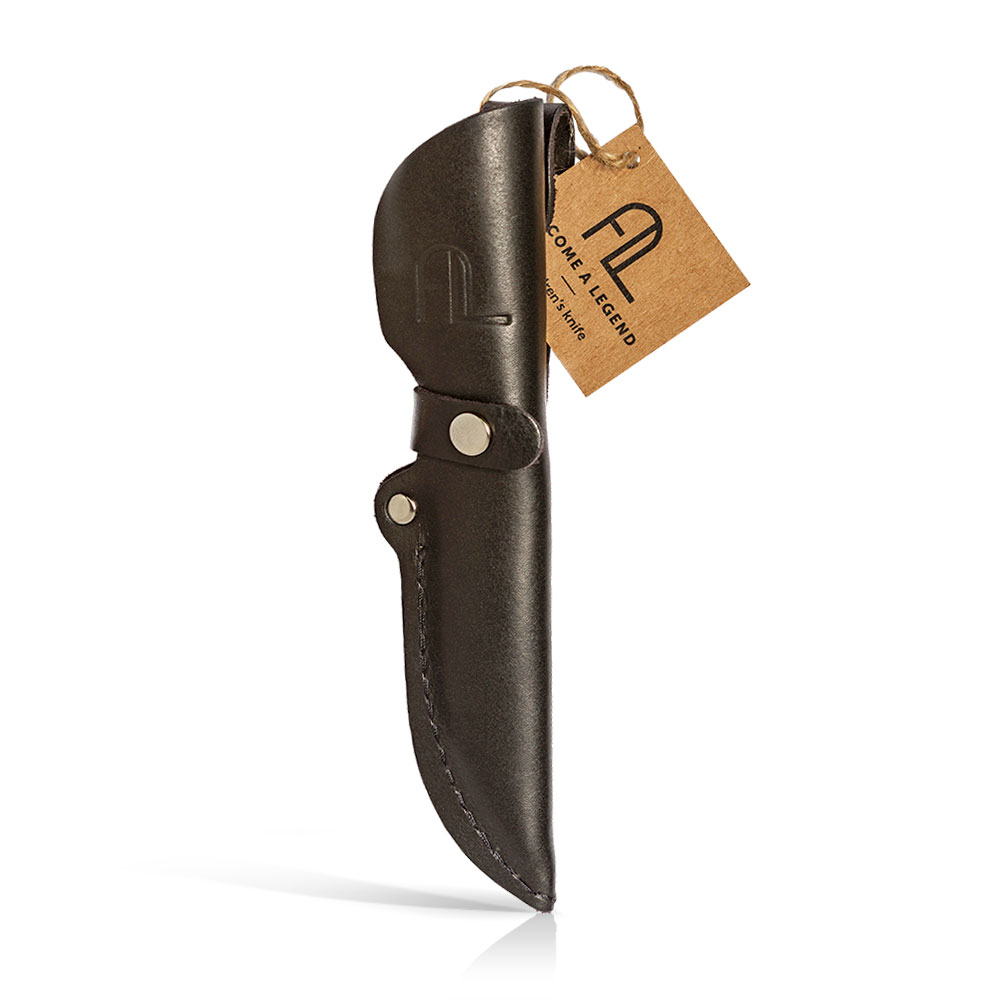 W zestawie z nożem otrzymujemy kaburę wykonaną ze skóry. Jest to klasyczne rozwiązanie pasujące stylem do narzędzia w niej się znajdującego. Drewno i skóra od zawsze stanowią idealne połączenie. Podobnie jak sam nóż, pochwa wykonana jest ręcznie, ma wysoki profil i chowa w sobie część rękojeści oraz dodatkowe zapięcie by lepiej zabezpieczać nóż przed wypadnięciem. Mocowana jest tradycyjnie do pasa w pozycji pionowej.