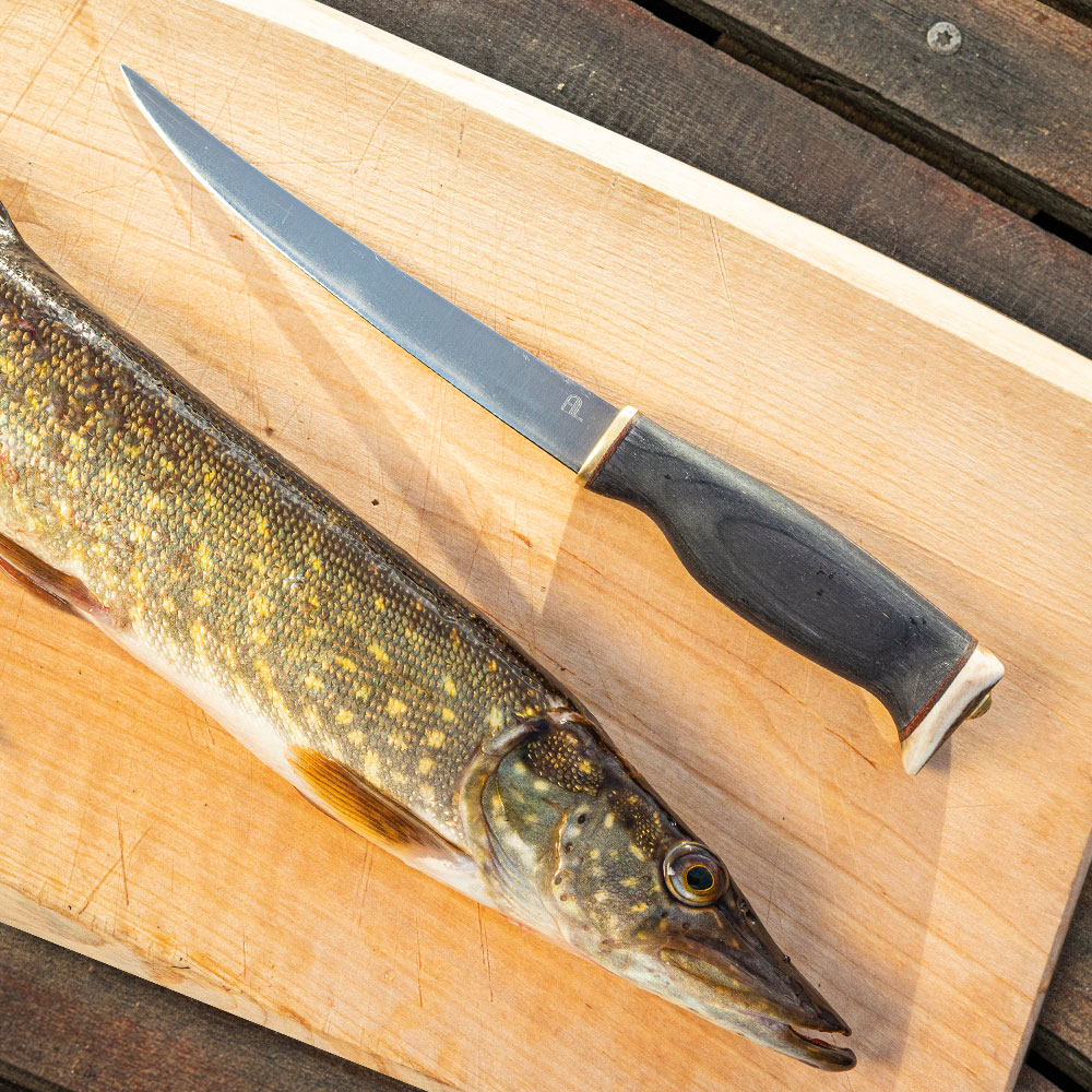 Fillet Knife posiada konstrukcję Rat Tail. Został wyposażony w długą, sprężystą głownię trailing point ze szlifem płaskim oraz pionowym, ręcznym satynowaniem. Ergonomiczną rękojeść wykonano z drewna brzozowego i poroża. Nóż posiada w zestawie ręcznie szytą pochwę skórzaną do przenoszenia w pozycji pionowej.