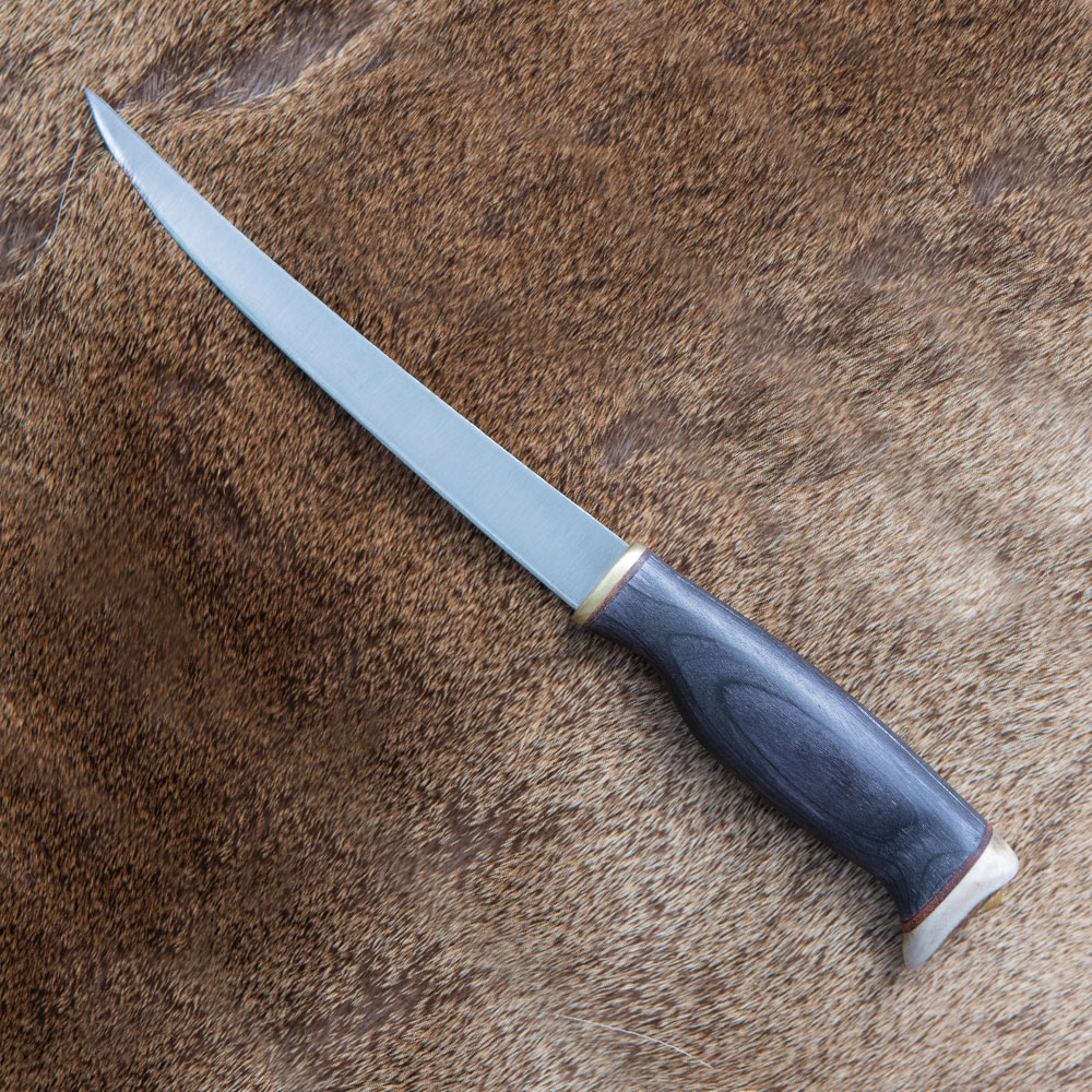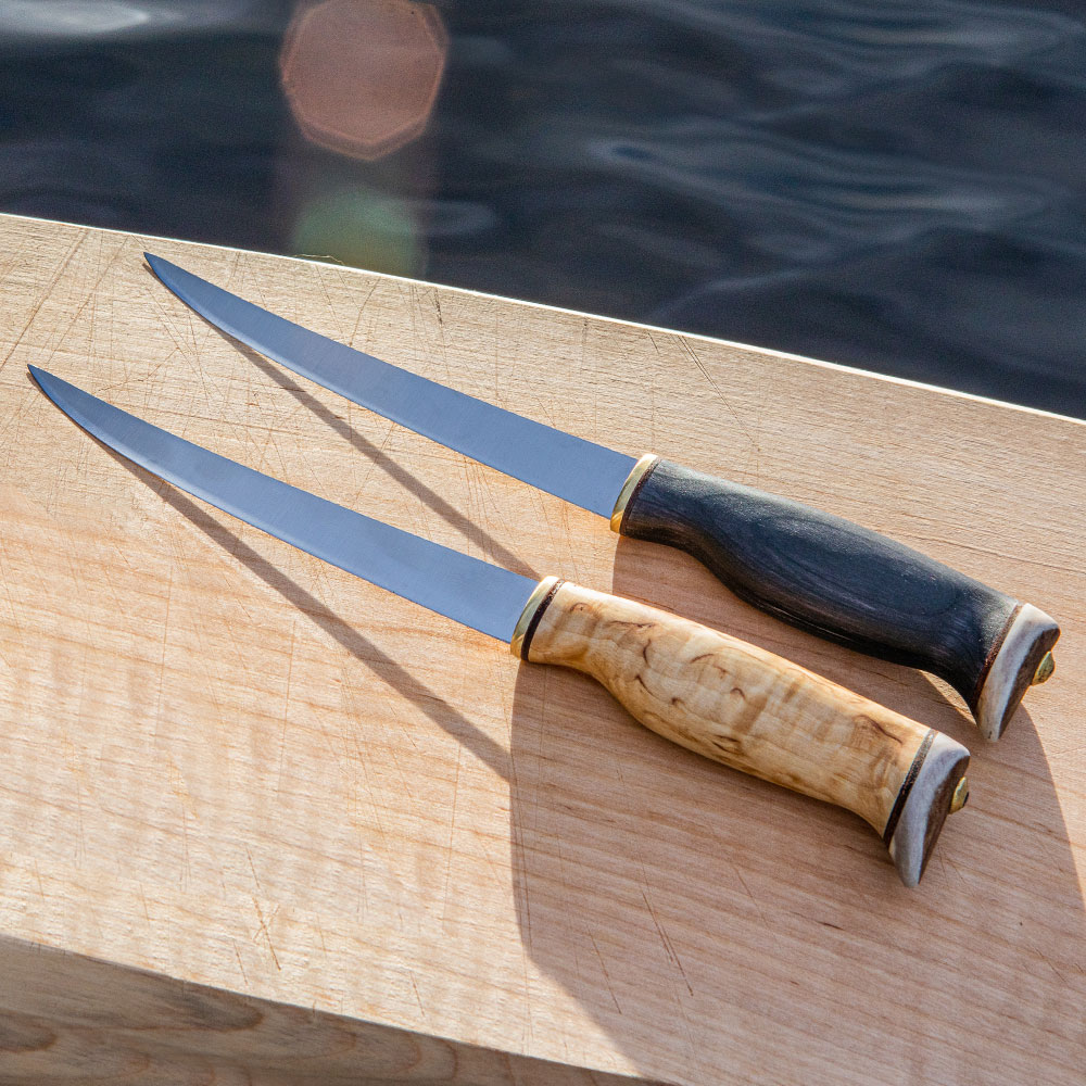 Nóż Arctic Legend Fillet Knife Stal Nierdzewna Czerniona Brzoza Karelska to tradycyjny fiński nóż o długiej głowni wykonany ręcznie z naturalnych materiałów stworzony do filetowania.