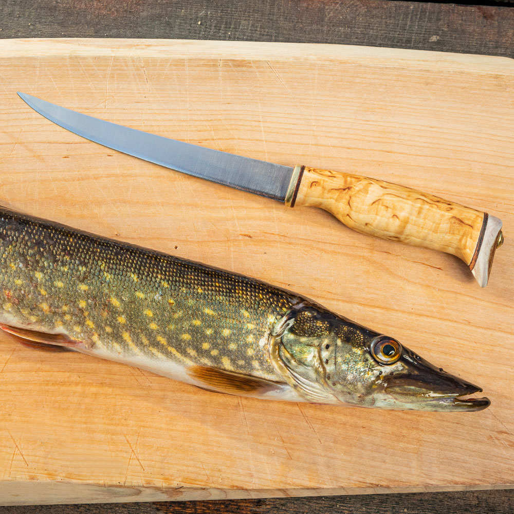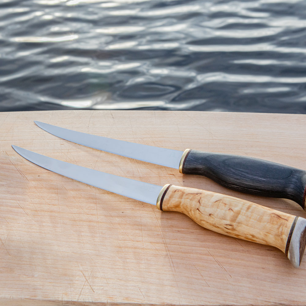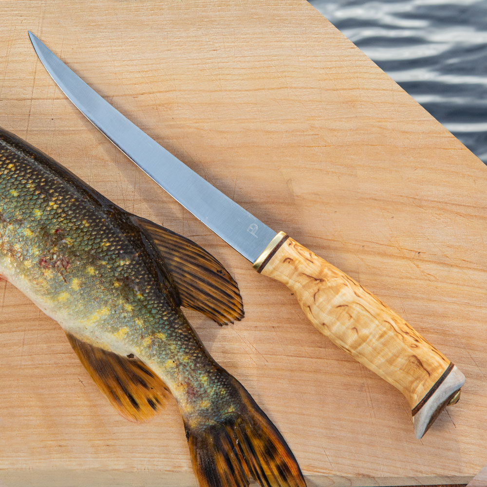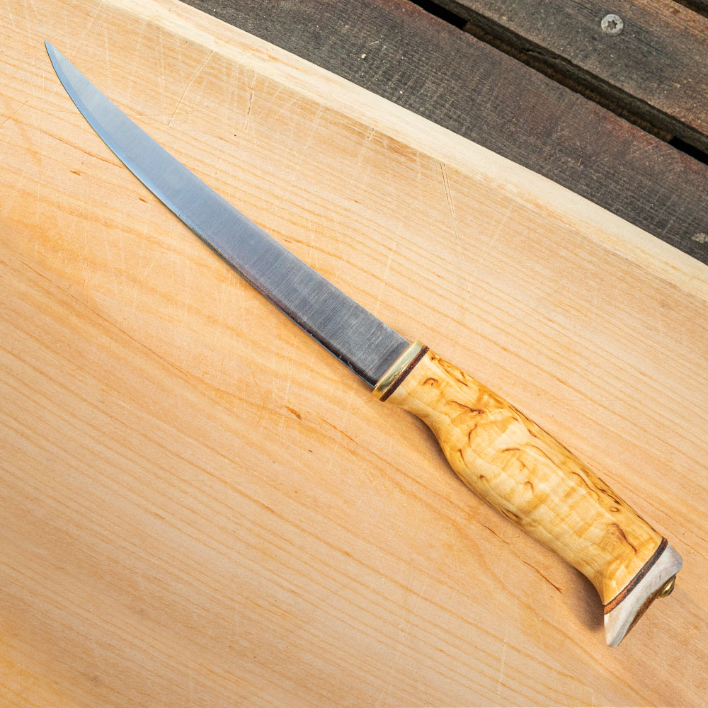 Nóż Arctic Legend Fillet Knife Stal Nierdzewna Brzoza Karelska to tradycyjny fiński nóż o długiej głowni wykonany ręcznie z naturalnych materiałów stworzony do filetowania.