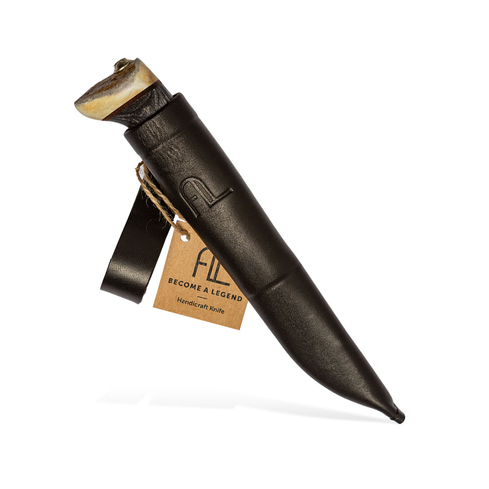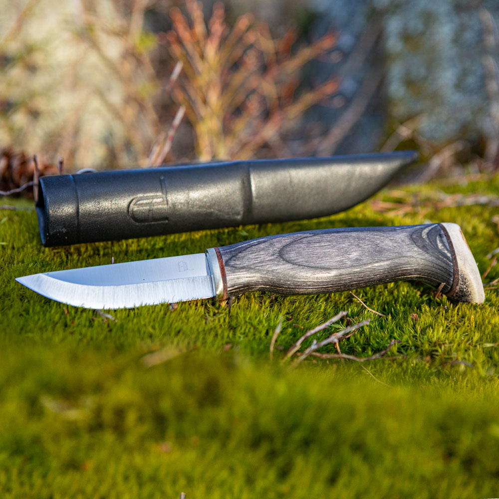 Rękojeść powstała z regionalnego, czernionego drewna brzozy karelskiej o bardzo charakterystycznym układzie słojów. Drewno to od lat z powodzeniem stosowane jest jako materiał rękojeści klasycznych noży skandynawskich. Samo jej zakończenie natomiast, wykonane jest z poroża co nadaje jej jeszcze większej indywidualności. Ergonomiczne wyprofilowana rękojeść zapewnia wygodny chwyt.