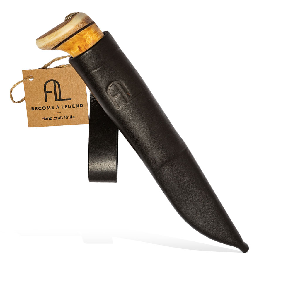 Rękojeść powstała z regionalnego drewna brzozy karelskiej o bardzo charakterystycznym układzie słojów. Drewno to od lat z powodzeniem stosowane jest jako materiał rękojeści klasycznych noży skandynawskich. Samo jej zakończenie natomiast, wykonane jest z poroża co nadaje jej jeszcze większej indywidualności. Profil rękojeści jest bardzo ergonomiczny i przemyślany, zapewniając właściwy i bardzo wygodny chwyt.