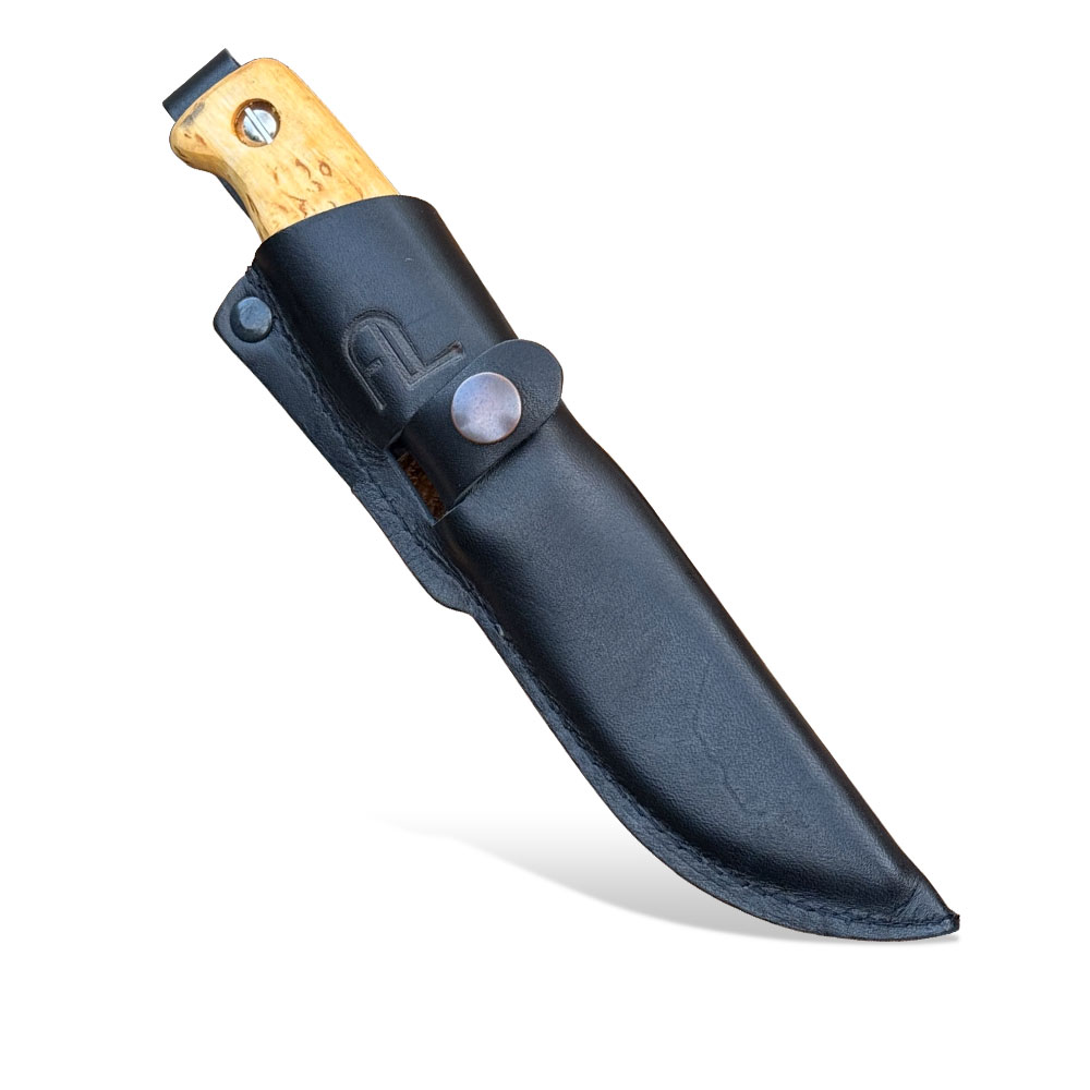 Prezentowany Hiker’s Knife wyposażony został w bardzo uniwersalną głownię o profilu drop point z prostym grzbietem i szlifem płaskim. Ostrze wykończono satyną. Rękojeść wykonano z drewna brzozy karelskiej. W zestawie z nożem dostarczana jest ręcznie szyta czarna skórzana pochwa do przenoszenia w pozycji pionowej.