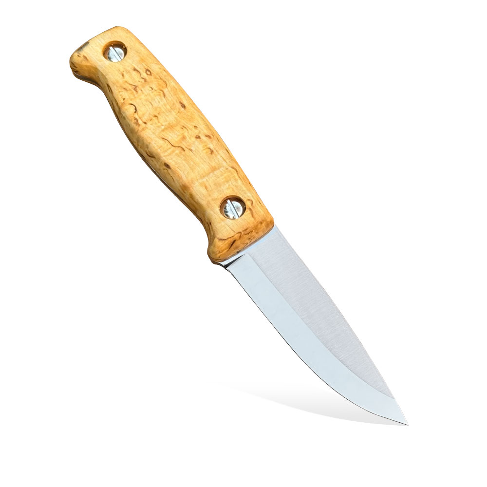 Nóż Arctic Legend Hiker’s Knife Stal Nierdzewna Brzoza Karelska to fiński nóż outdoorowy, w dużej mierze wykonany ręcznie z użyciem naturalnych materiałów. W odróżnieniu od większości ostrzy marki projektowanych z ukrytym trzpieniem w rękojeści (hidden tang), posiada konstrukcję full tang, dającą jeszcze większą wytrzymałość podczas wykonywania różnorodnych prac.