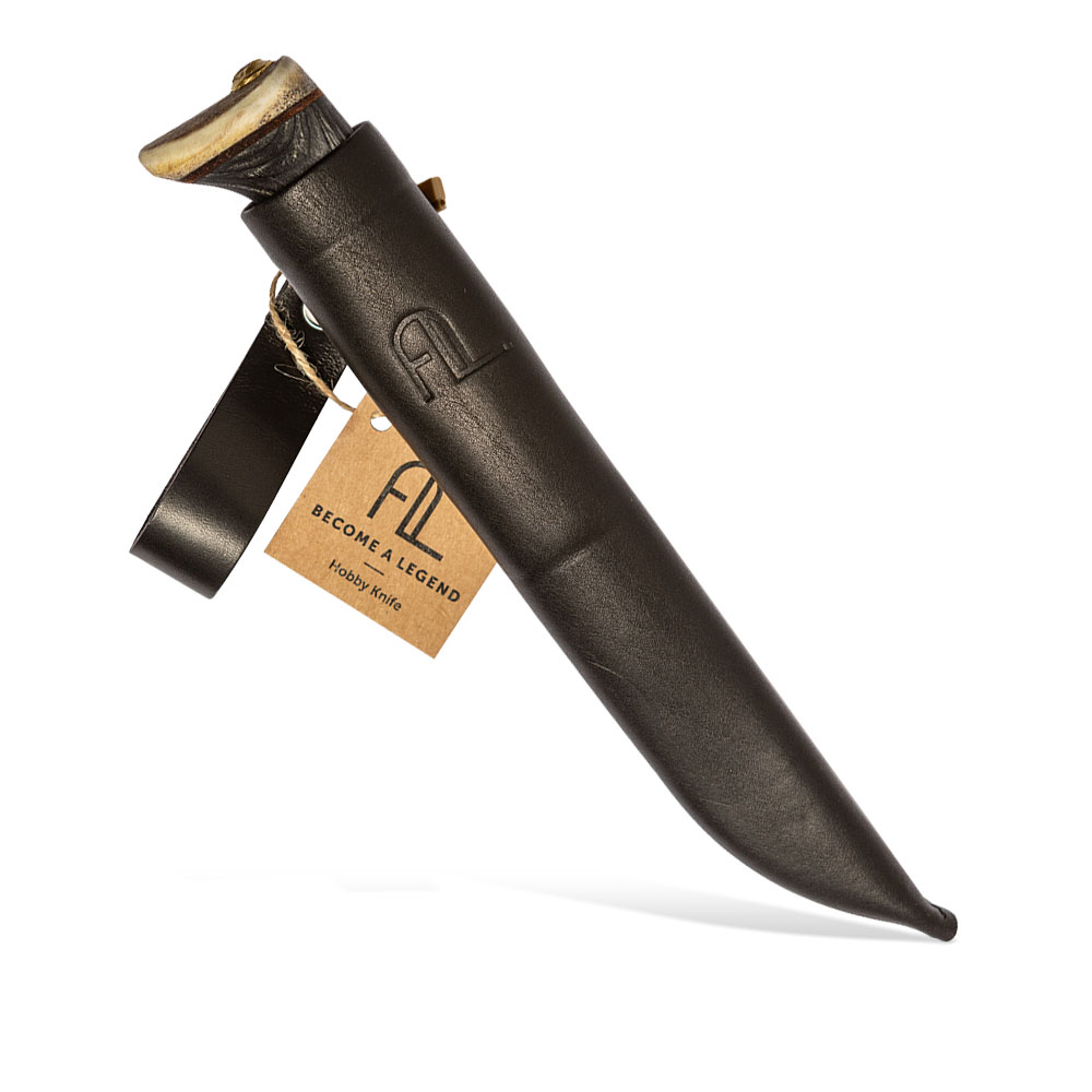 Rękojeść powstała z regionalnego, czernionego drewna brzozy karelskiej o bardzo charakterystycznym układzie słojów. Drewno to od lat z powodzeniem stosowane jest jako materiał rękojeści klasycznych noży skandynawskich. Samo jej zakończenie natomiast, wykonane jest z poroża co nadaje jej jeszcze większej indywidualności. Ergonomiczne wyprofilowana rękojeść zapewnia wygodny chwyt.