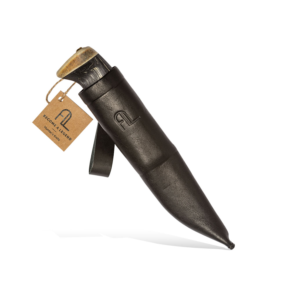 Hunter’s Knife posiada konstrukcję Rat Tail. Został wyposażony w głownię z grzbietem prostym i szlifem płaskim oraz pionowym ręcznym satynowaniem. Ergonomiczną rękojeść wykonano z drewna brzozowego i poroża. Nóż posiada w zestawie ręcznie szytą pochwę skórzaną do przenoszenia w pozycji pionowej.